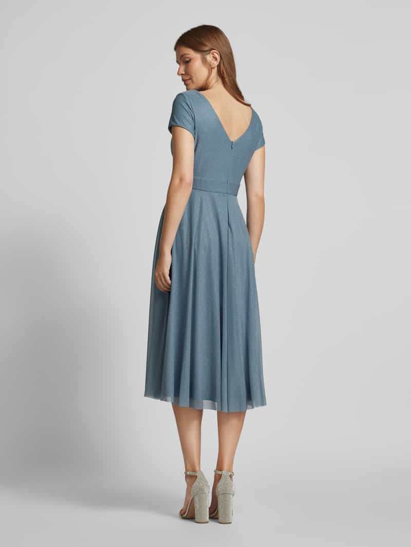 Midi-jurk van Vera Mont;Getailleerd model;V-hals;Tailleband;Ritssluiting achter;Ruglengte bij maat 36: 100 cm;Borstomvang bij maat 36: 37 cm;Mouwlengte bij maat 36: 14 cm