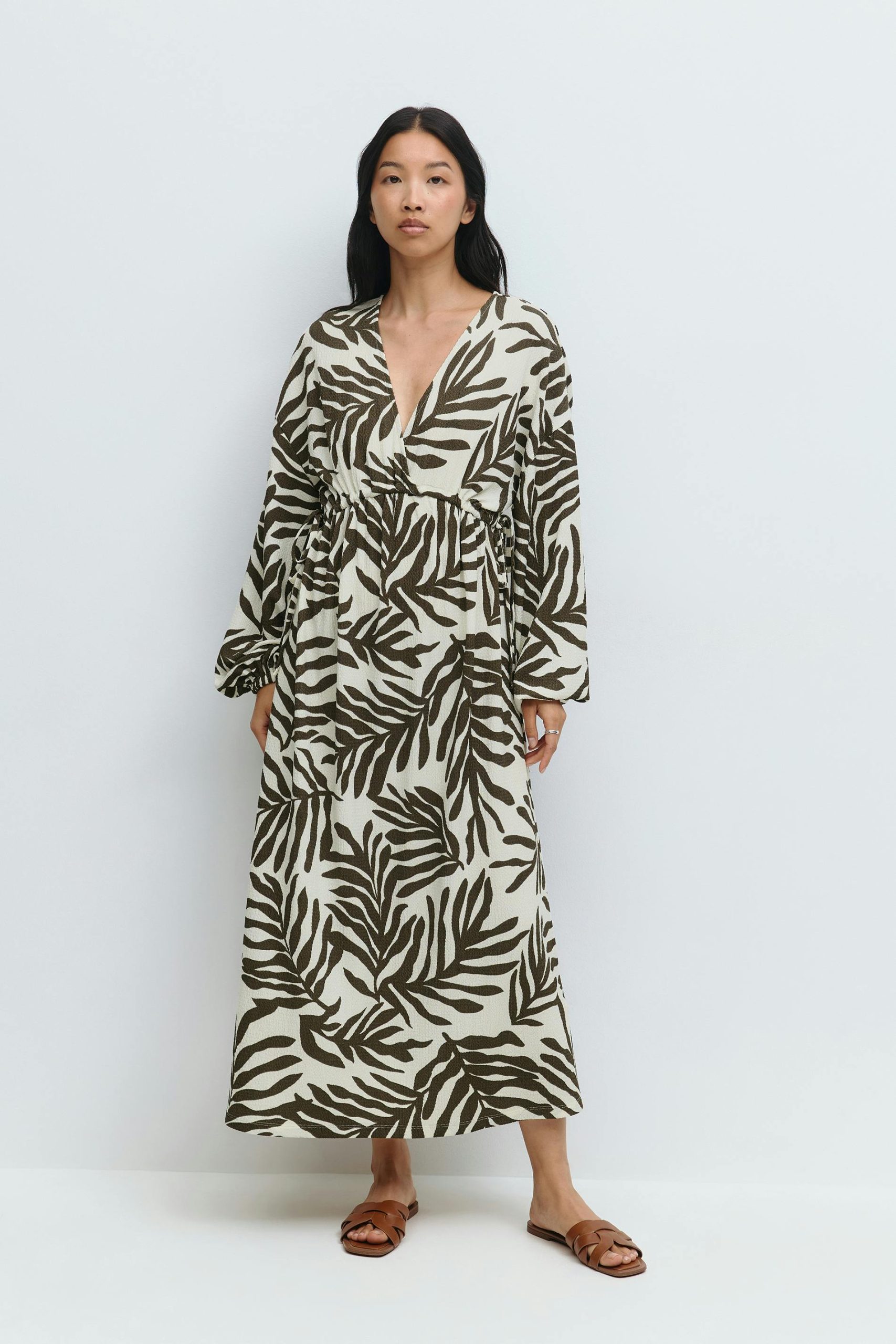 Aan de voorkant omgevouwen jurk met patroon met getextureerde doek. De jurk heeft midi-lengte. Het heeft ballonmouwen, v-hals, normale pasvorm en zelfbinder aan de zijkant.