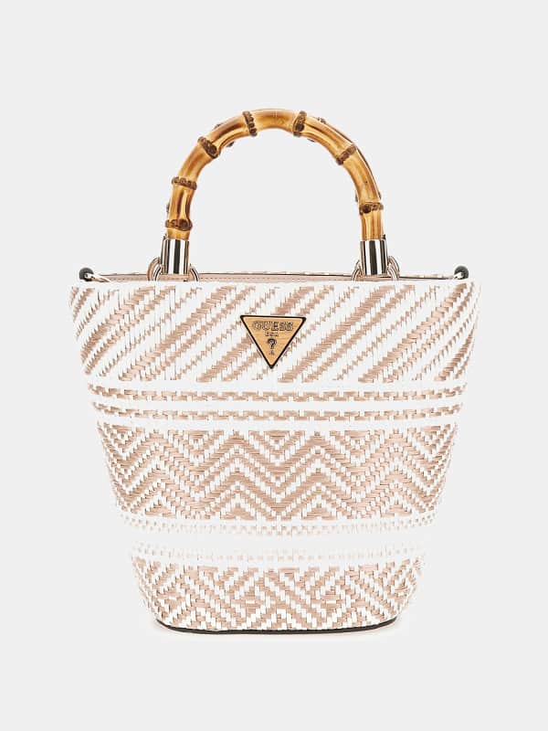 Buitenkant van raffia-materiaal.Sluiting met knoop.Licht-goudkleurige metalen onderdelen.Geometrische bewerking.Binnenzak met rits.Driehoeklogo van metaal op de voorkant.hengsels van bamboe.