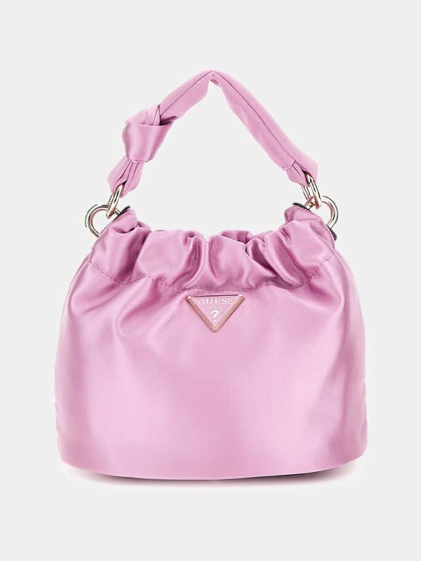 Buitenkant van satijn.Sluiting met knoop.Licht-goudkleurige metalen onderdelen.Binnenzak met rits.Driehoeklogo van metaal op de voorkant.Gepersonaliseerde voering met logo.