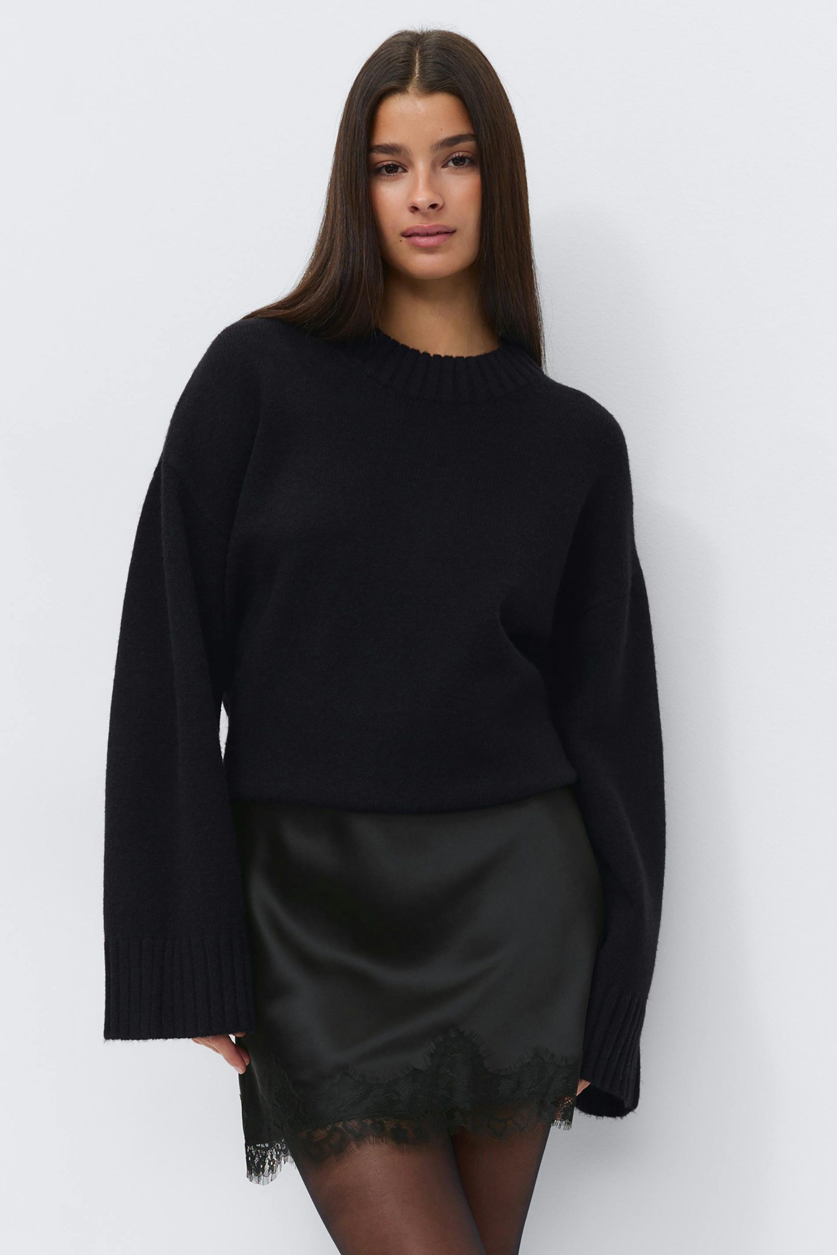 Korte rok van satijn met kant aan de onderkant. De rok is zwart en heeft een elastische midden taille. Het heeft een normale pasvorm.