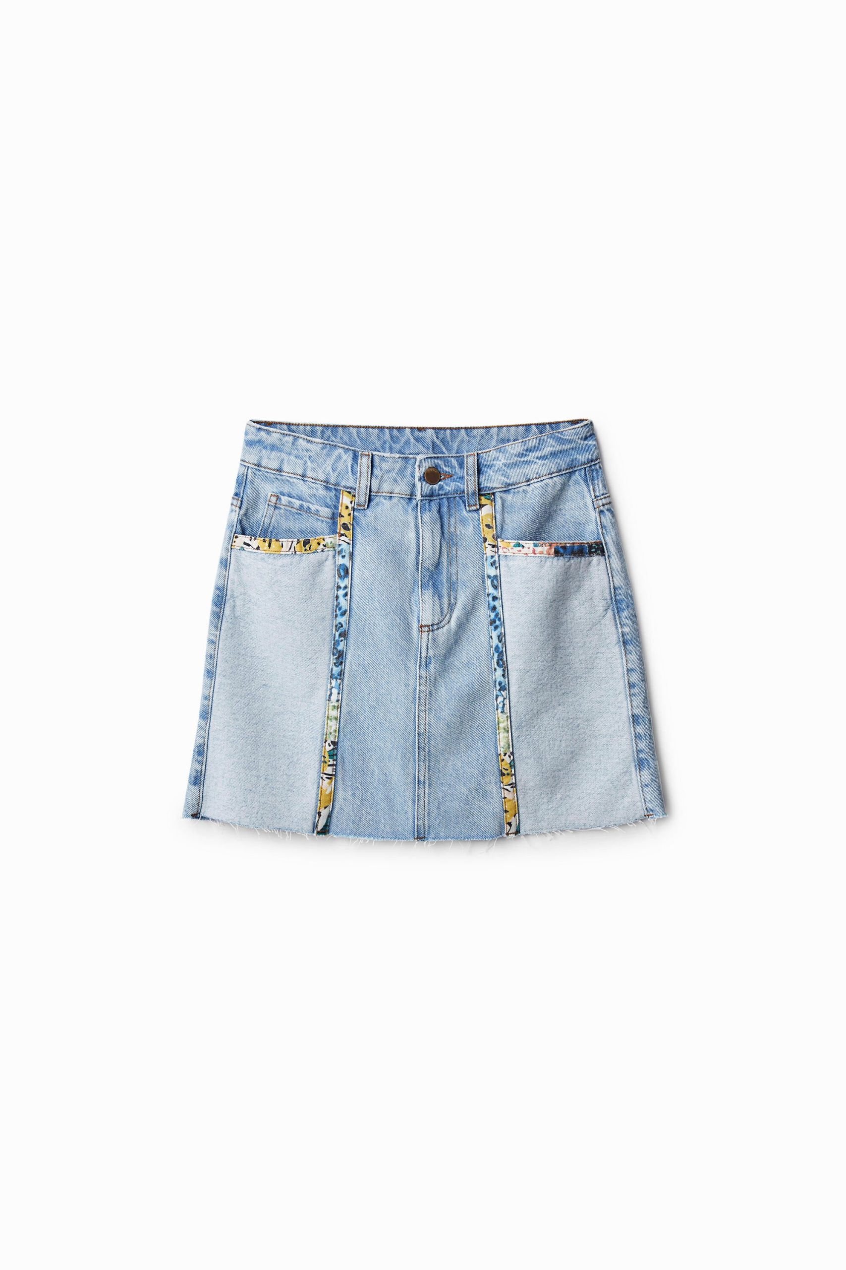 Mini spijkerrok met raw cut aan de zoom en een licht wijd uitlopend patroon in patch stoffen met stroken in dierenprint. Combineer met crop tops van de collectie.
