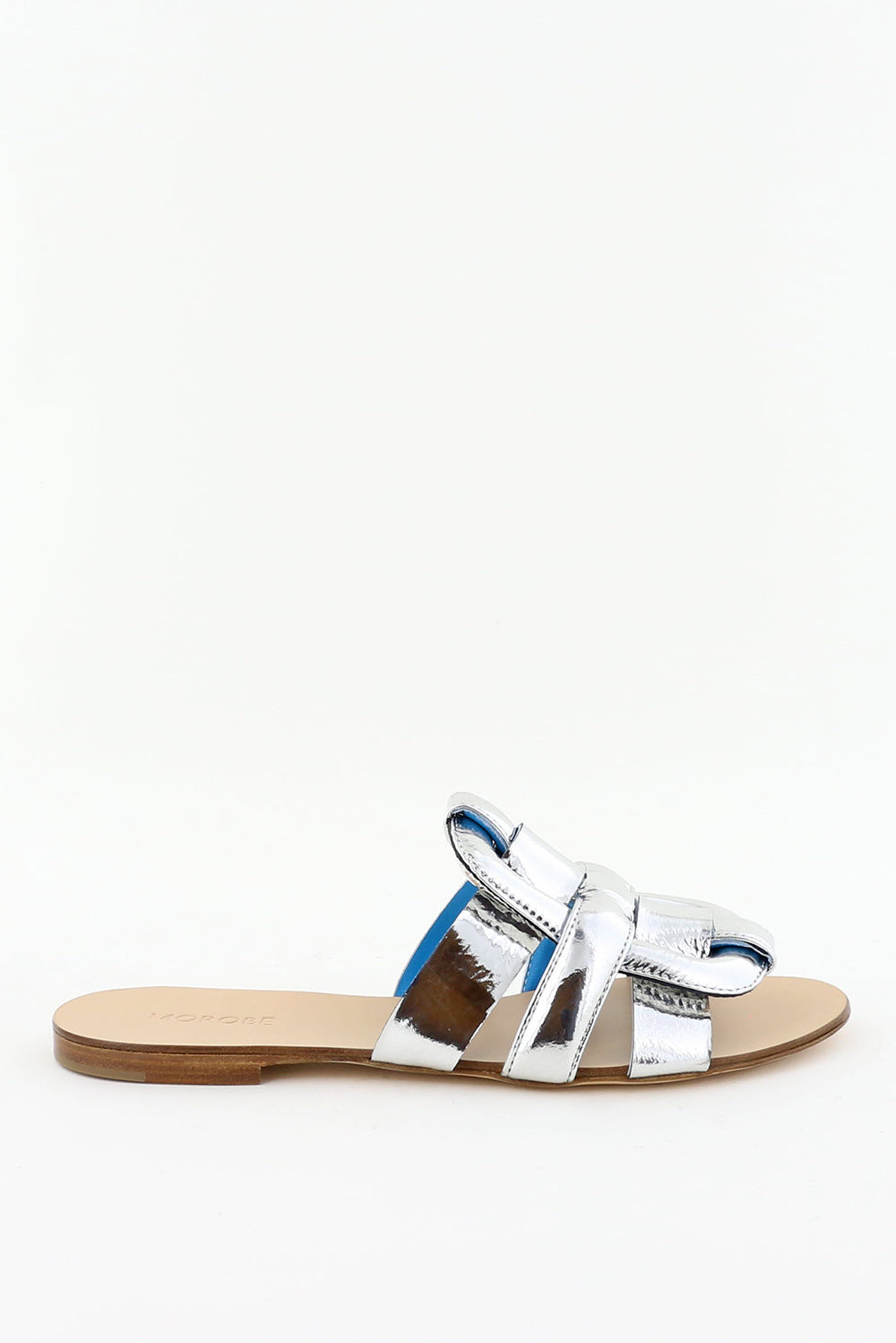 Mooie slippers van het merk Morobe, model Robien, in de kleur zilver. Op de voorkant van de slippers zitten de kenmerkende leren details. Ze hebben een normale pasvorm. Perfect in de zomer voor onder een short en een blousje.