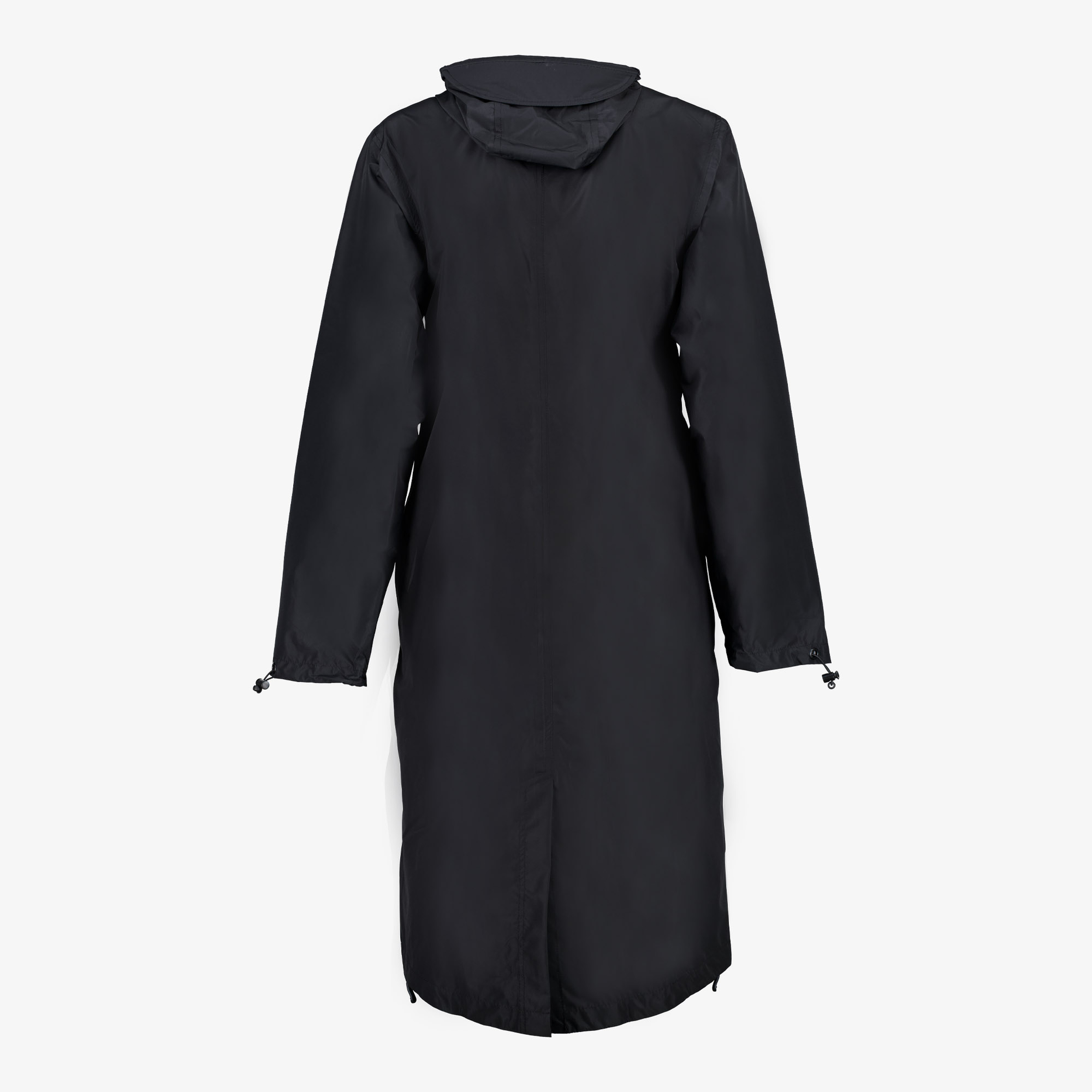 Zwarte Mountain Peak regenjas/parka voor dames. Voorzien van een vaste capuchon en een handlus tegen het opwaaien tijdens het fietsen. De regenjas is te tailleren met een elastisch koord. Deze lichtgewicht jas is waterdicht en heeft waterdichte naden. Voorzien van een rits die afgesloten kan worden en klepzakken waarin je je spullen droog kunt bewaren. De mouwopeningen zijn verstelbaar. De 2-in-1 regenjas kan over het stuur van je fiets geplaatst worden, zodat je geen natte en koude handen krijgt. Tevens voorzien van een klepje in de capuchon dat regen uit het gezicht houdt. De jas heeft een waterkolom van 10.000 mm. Gemaakt van 100% polyester.