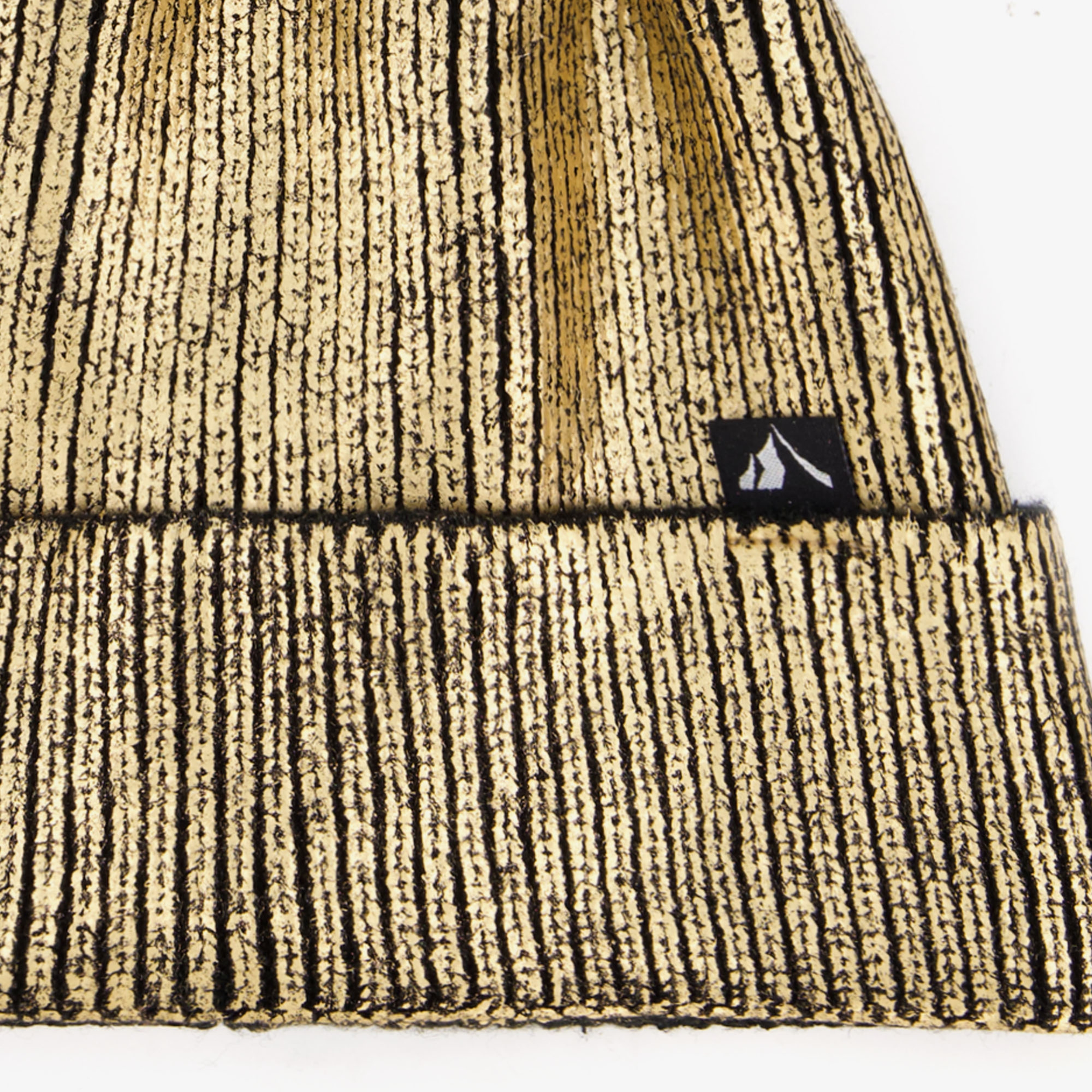Goudkleurige muts voor dames van Mountain Peak. Voorzien van een omslag met een kleine merkopdruk en een zwarte pompon aan de bovenzijde. gemaakt van 90% acryl en 10% polyester.