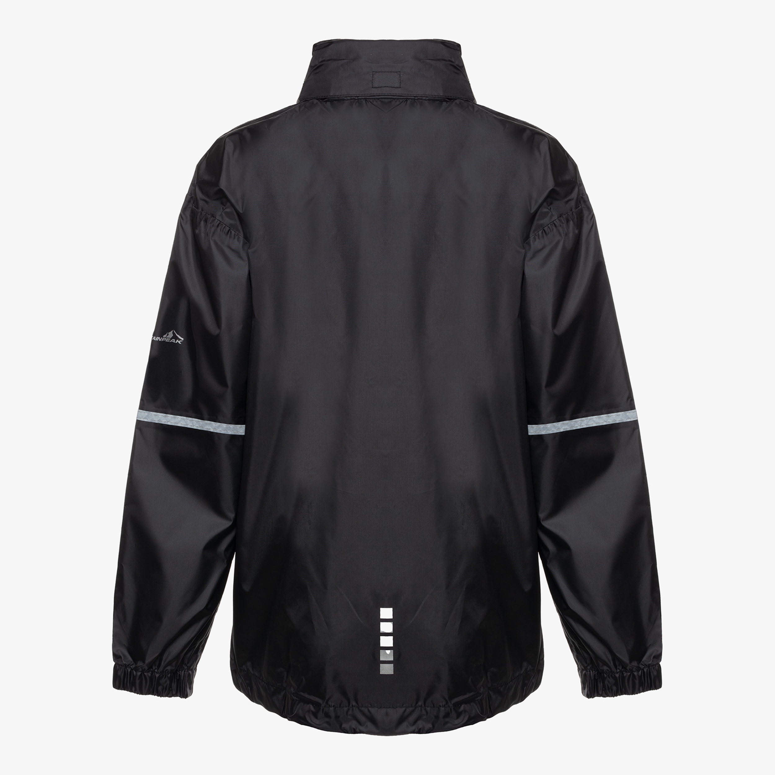 Zwarte regenjas voor kids van Mountain Peak. Voorzien van een ritssluiting met overlappende klittenbandsluitingen zodat wind en regen tegen gehouden worden. De regenjas heeft elastische boorden en is aan de onderzijde aan te snoeren. Voorzien van een oprolbare capuchon en een waterdichtheid tot 2000mm. De winddichte regenjas heeft een handig opbergzakje en op de armen zijn reflecterende accenten aangebracht zodat je goed opvalt in het verkeer. Gemaakt van polyester.