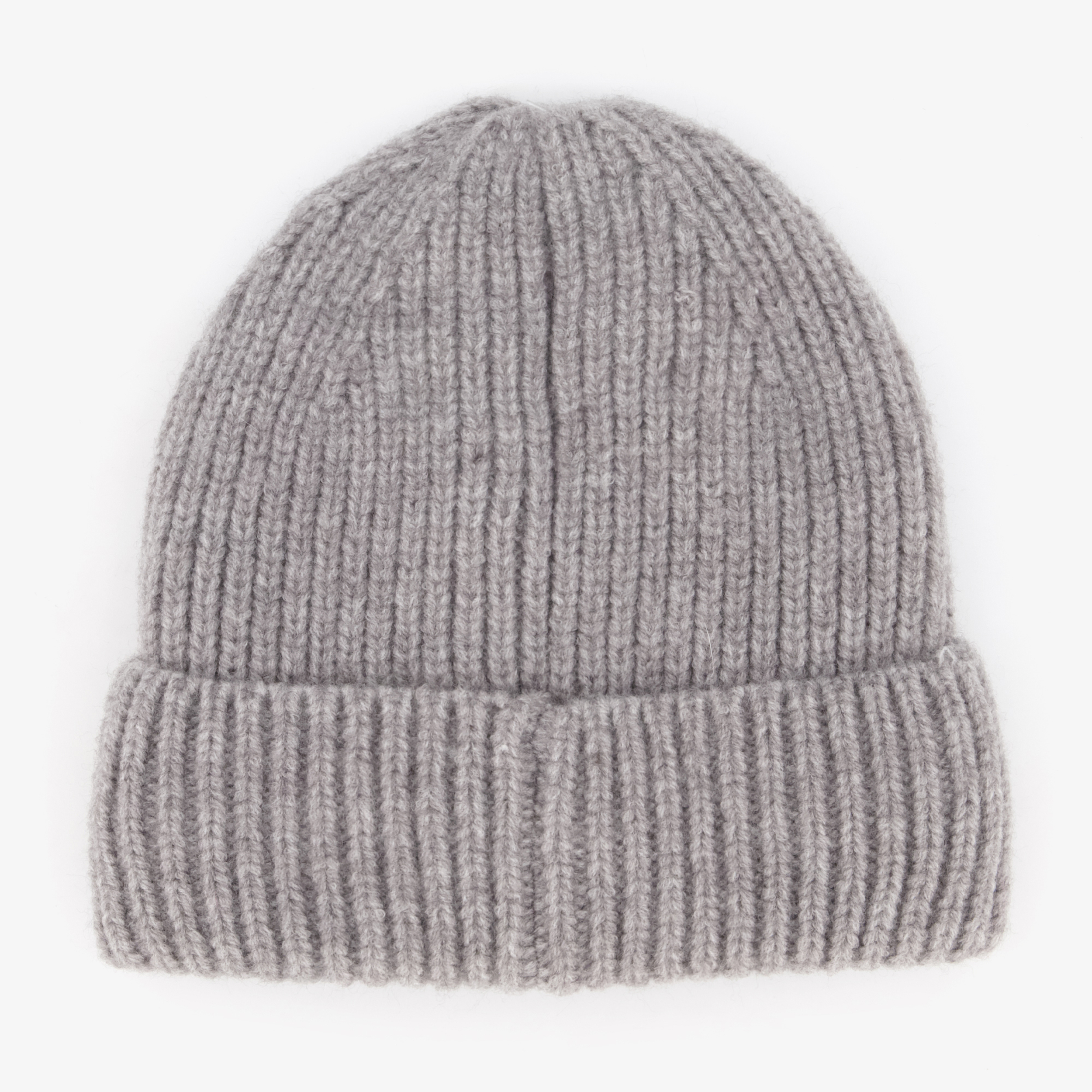 Grijze muts voor dames. De beanie heeft een omslag en versierd met parels en strasstenen. De binnenkant is gevoerd. Gemaakt van 40% acryl, 30% polyester en 30% nylon.