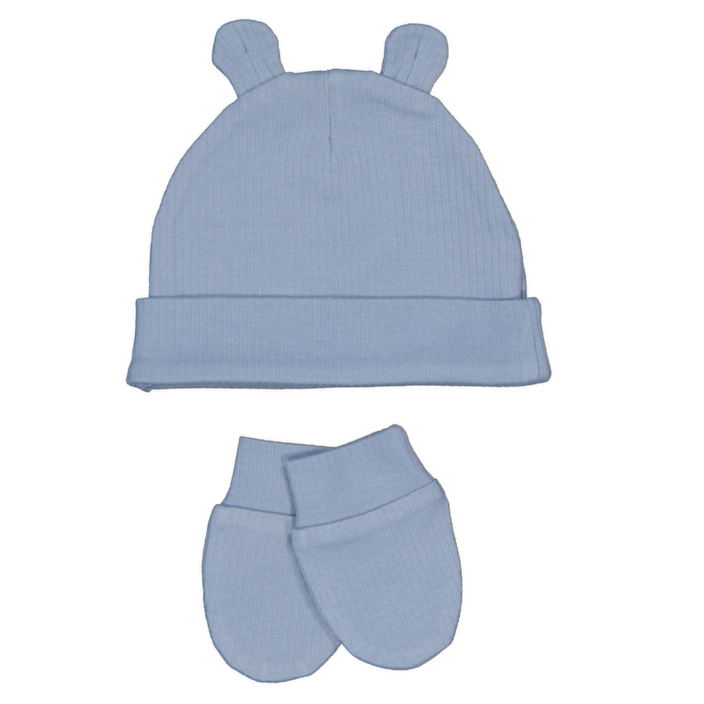 Dit setje bestaat uit een zachte blauwe muts en bijpassende wanten, perfect voor baby's. Gemaakt van 95% katoen en 5% elastaan, biedt het comfort en een lichte rekbaarheid. De muts heeft een leuke detail met oortjes en sluit mooi aan. Ideaal om warm te blijven.