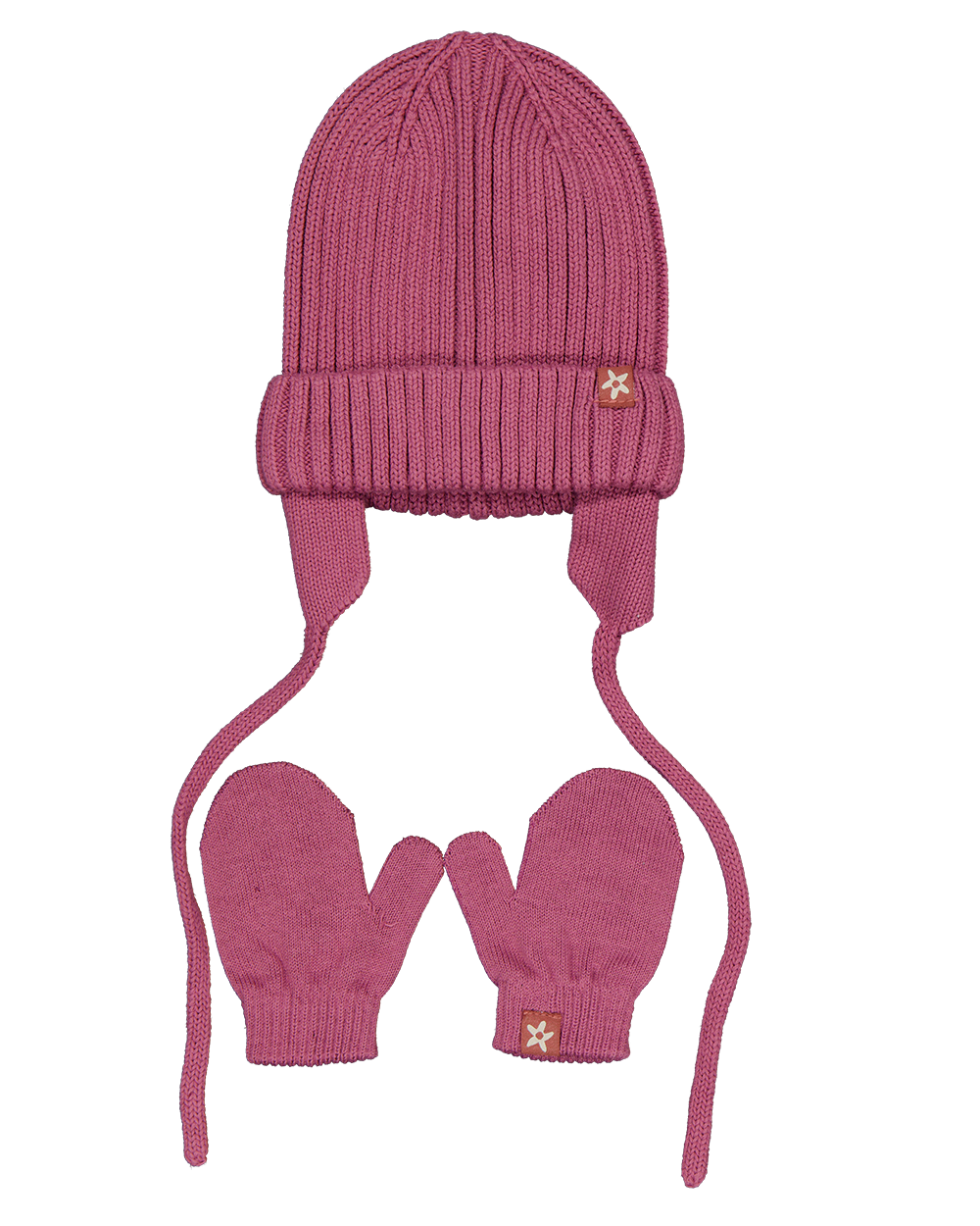 Deze set bestaat uit een gebreide muts en wanten voor baby's in een rode kleur. De muts is voorzien van lange koorden om vast te maken onder de kin en heeft een omgeslagen rand. Op zowel de muts als de wanten is een klein labeltje zichtbaar. De ribstructuur zorgt voor een warme en comfortabele pasvorm voor je kind tijdens koudere dagen.