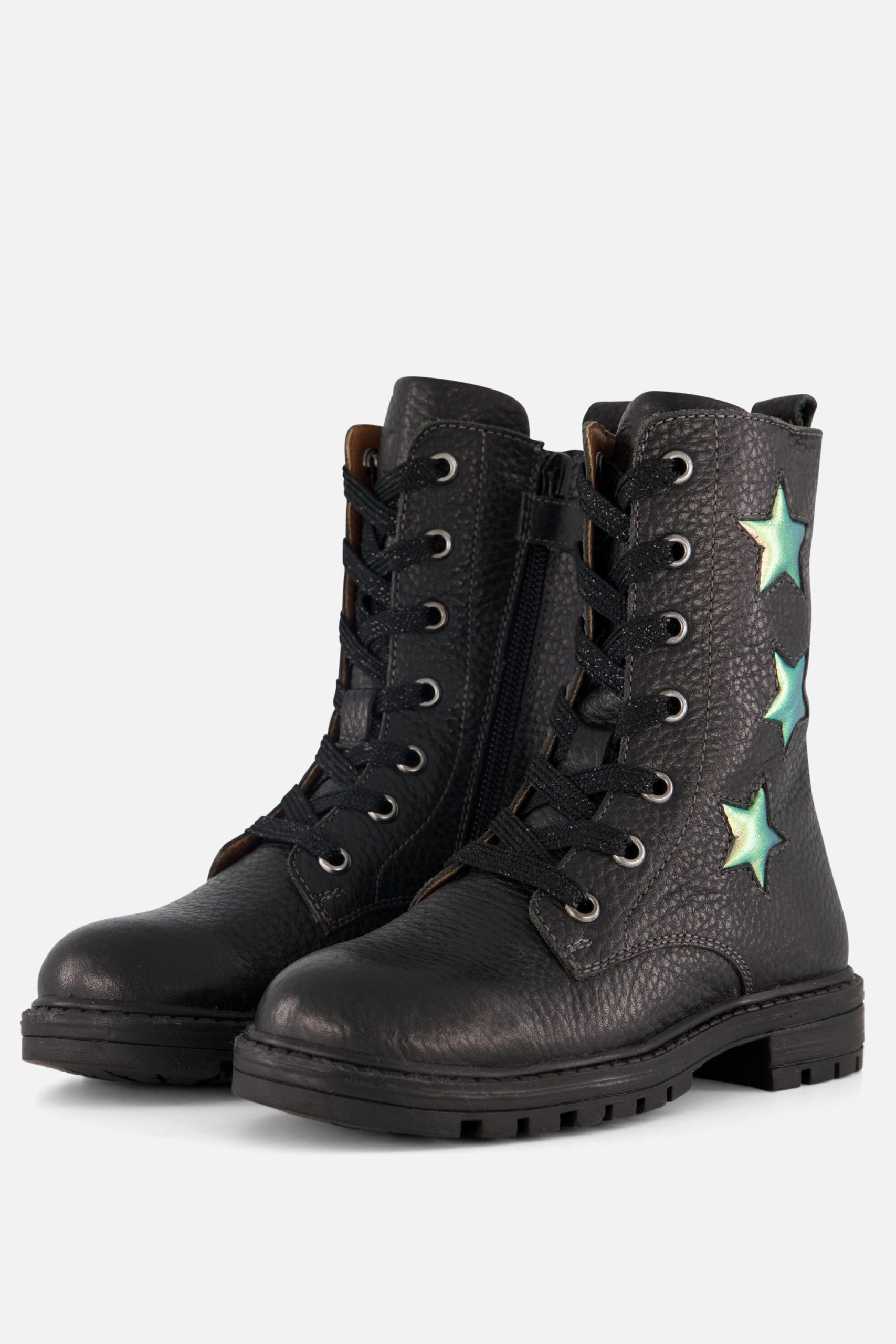 Deze stoere veterboots van Muyters zijn volledig gemaakt van leer en vallen meteen op door de metallic sterren aan de zijkant, een echte eyecatcher! De combinatie van een rits en vetersluiting zorgt niet alleen voor gemak, maar ook voor een perfecte pasvorm. Het uitneembare voetbed biedt extra comfort.
