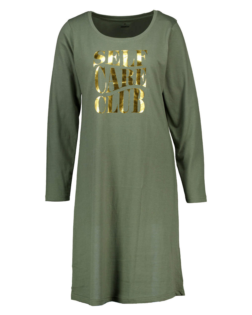 Dit damesnachthemd in het groen heeft een ronde hals en lange mouwen. De goudkleurige opdruk geeft een vrolijke uitstraling. Het nachthemd is gemaakt van 100% katoen, waardoor het zacht en soepel aanvoelt. Door de enkele jersey kwaliteit draagt het comfortabel. Geschikt om in te slapen of om thuis te ontspannen.