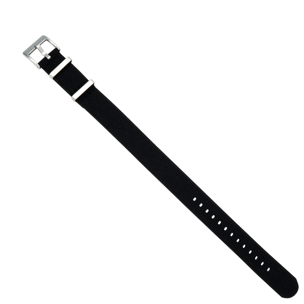 Elastische NATO horlogeband in de kleur zwart, met hoog draagcomfort. Geschikt voor alle horloges die beschikken over een lug breedte van 20 mm. Met edelstalen sluiting en edelstalen lussen