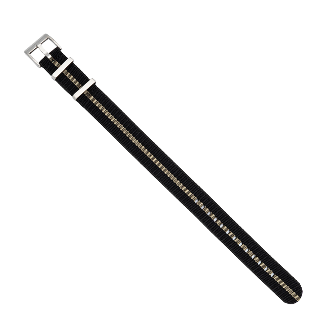 Elastische NATO horlogeband in de kleur zwart en beige, met hoog draagcomfort. Geschikt voor alle horloges die beschikken over een lug breedte van 20 mm. Met edelstalen sluiting en edelstalen lussen.