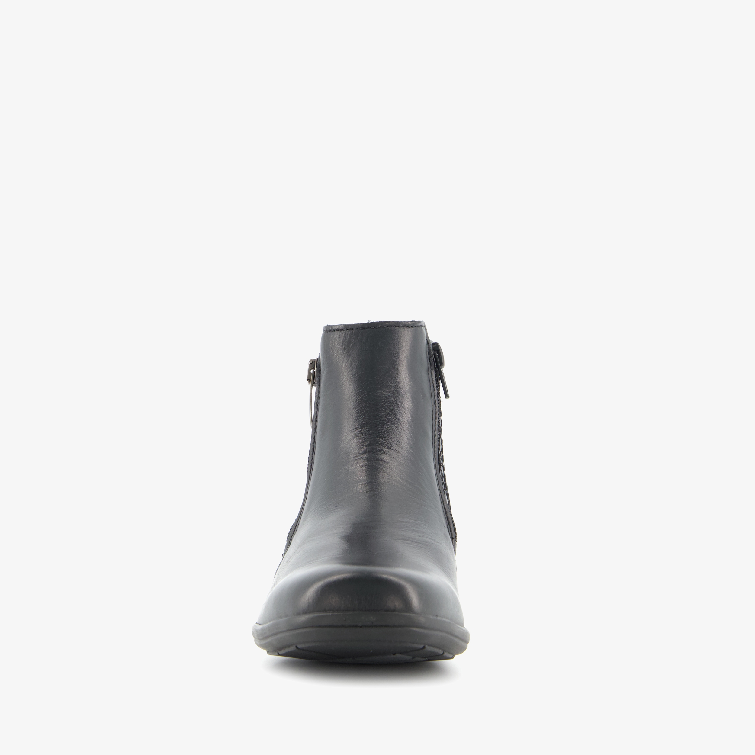 Lage, zwarte enkellaarsjes voor dames van Natuform. Gemaakt van leer, een binnenwerk van leer en een rubberen zool. De laarsjes hebben een ritssluiting aan de binnenzijde en een sierrits aan de buitenzijde. Het voetbed is gemaakt van textiel en is uitneembaar zodat je je eigen zooltjes in de schoenen kunt dragen. Voorzien van een subtiel dessin op het bovenwerk en een schachthoogte van 9 cm.