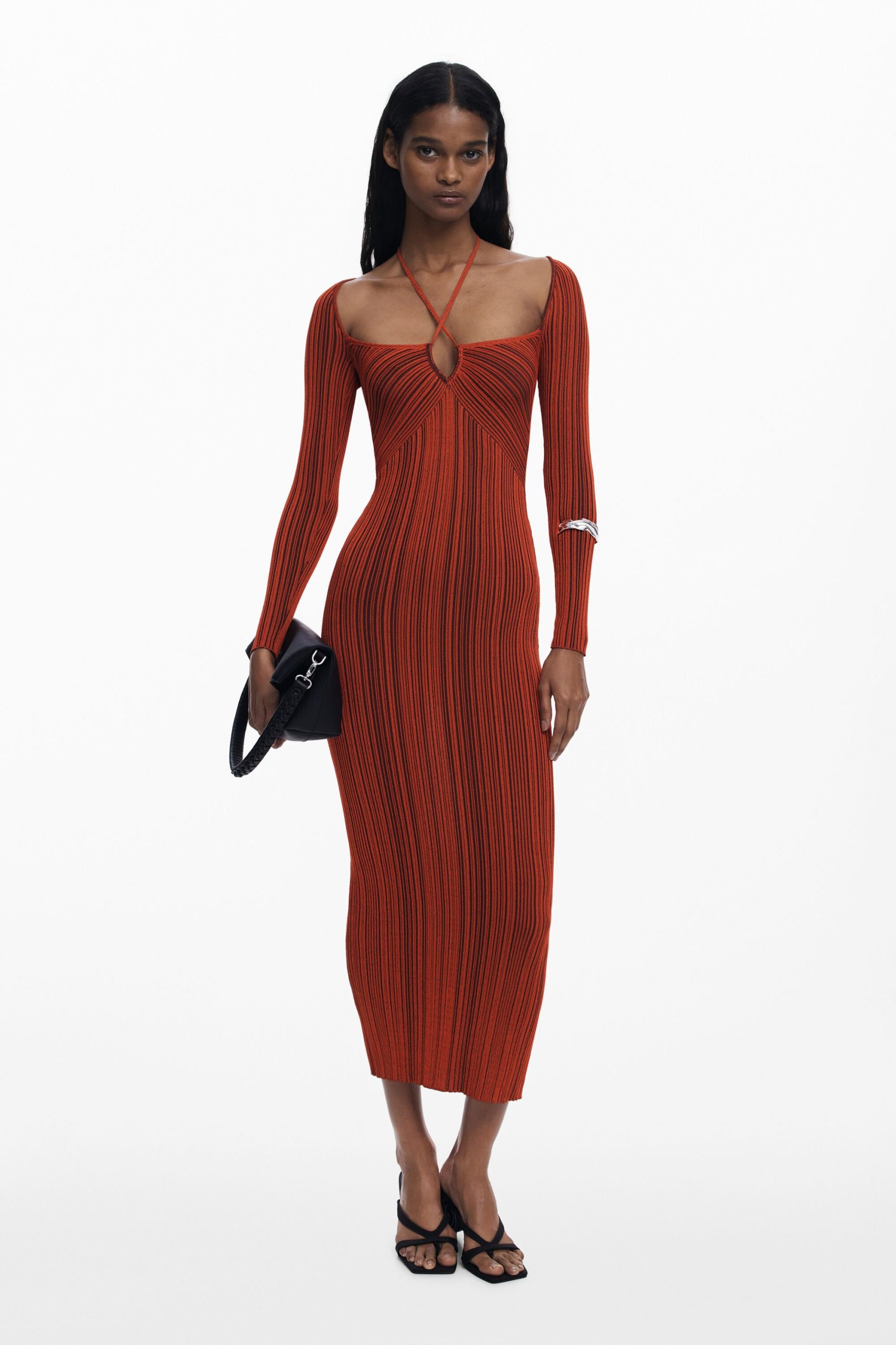 Nauwsluitende midi-jurk met lange mouwen, verticale strepenprint en diepe halslijn met cut-out en gekruiste bandjes.