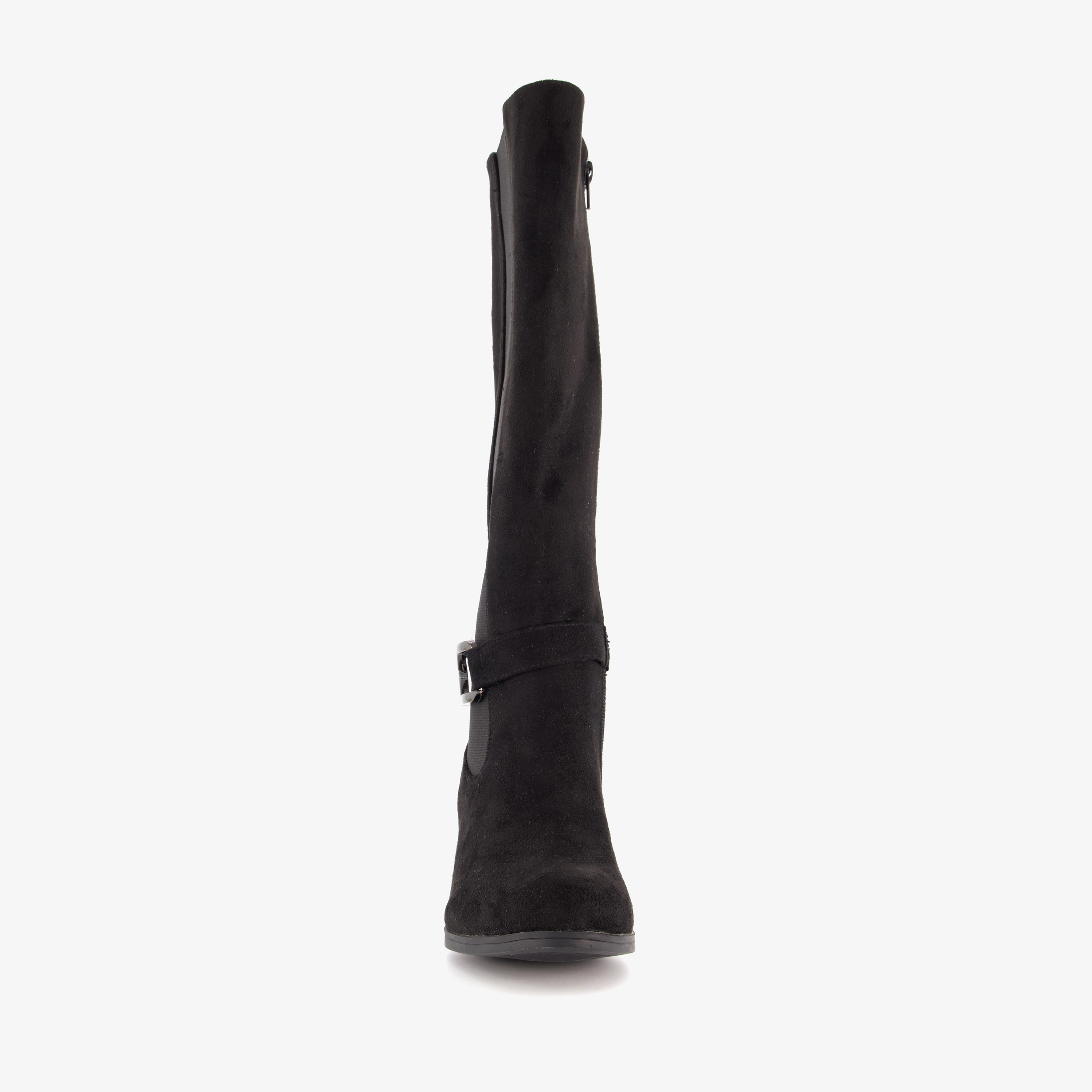 Hoge, zwarte laarzen voor dames van Nova. Gemaakt van imitatiesuede, een binnenwerk van textiel en een rubberen zool. De laarzen hebben een ritssluiting aan de binnenzijde en vast voetbed van imitatieleer. Aan de buitenzijde zit een elastische inzet voor een fijne pasvorm. De hoge laarzen hebben een schachthoogte van 35 cm en een blokhak van 6 cm.