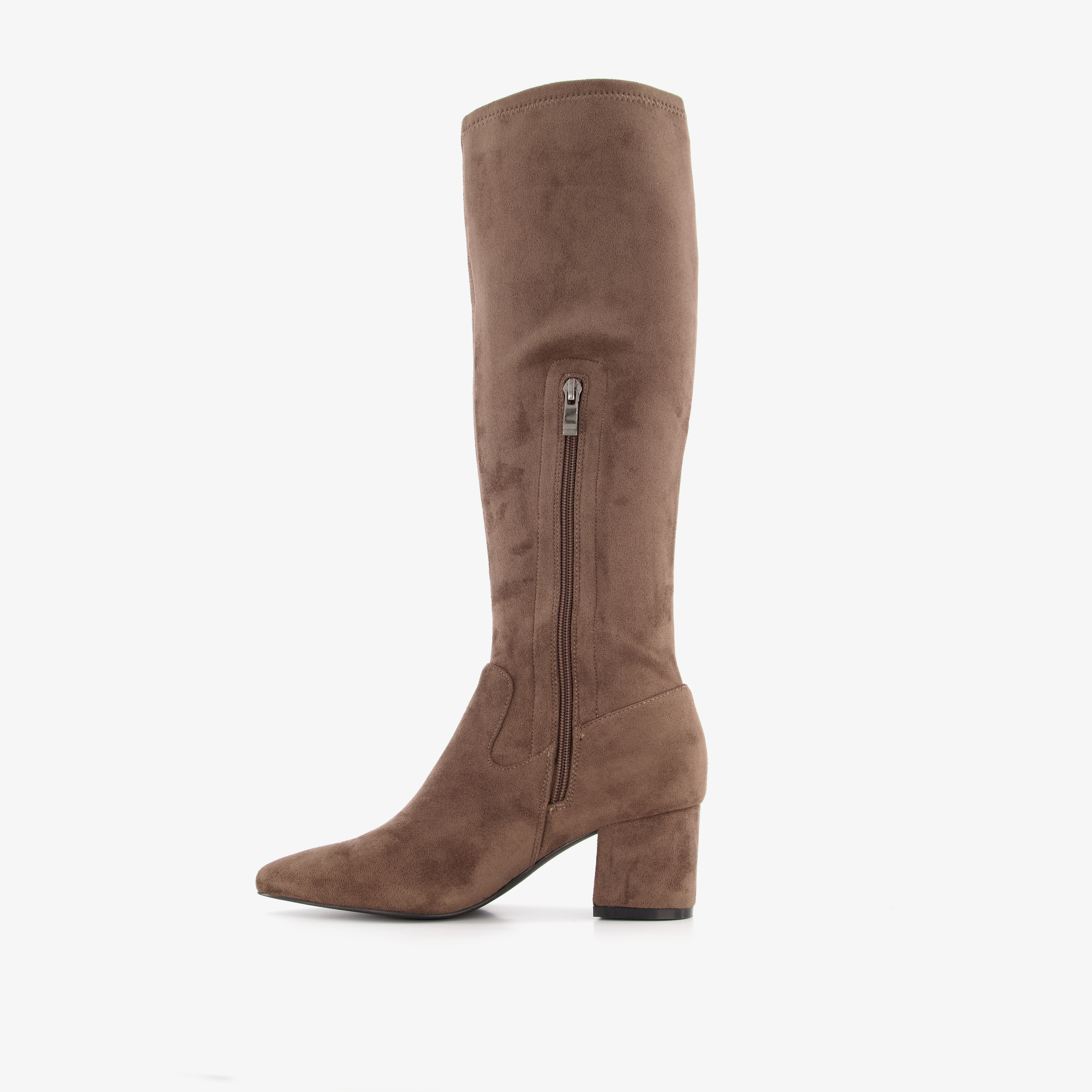 Hoge, bruine laarzen met hak voor dames. Gemaakt van imitatiesuede, een binnenwerk van textiel en een stevige zool. De laarzen hebben een halve ritssluiting aan de binnenzijde en vast voetbed van imitatieleer. Voorzien van een spitse neus, schachthoogte van 42 cm en een blokhak van 6 cm.