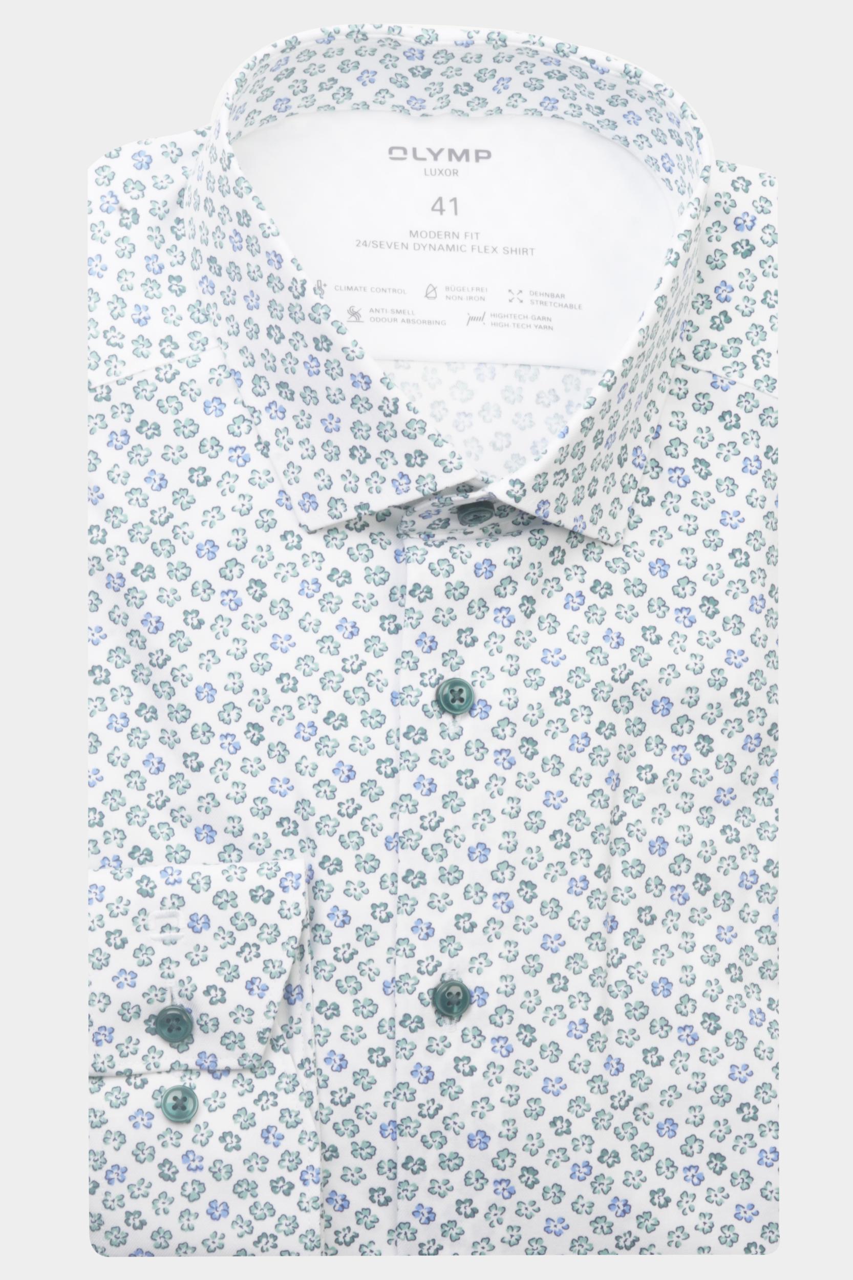 Dankzij de individuele en sympathieke businesslook met uniek draagcomfort weet de hele linie met innovatief OLYMP CLIMATE CONTROL-weefsel te overtuigen. Het is ademend, rekbaar, sneldrogend en temperatuur- en vochtregulerend. Nauwsluitende moderne pasvorm, sportieve moderne kentkraag, contrasterend binnenbeleg, kleuraccent op groen.