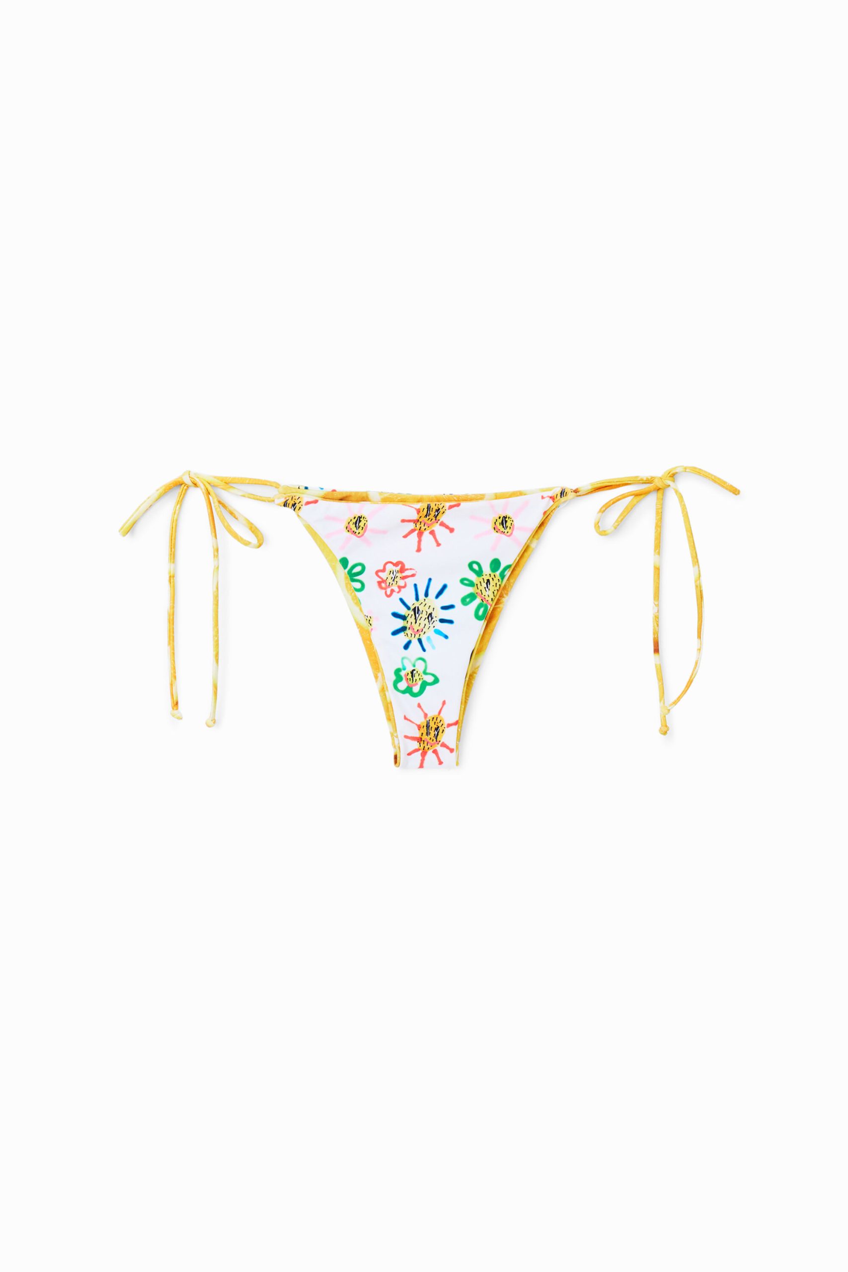 Omkeerbaar Braziliaans bikinibroekje met strikbandjes aan de zijkant. Met twee prints: citroenen en arty zonnen.