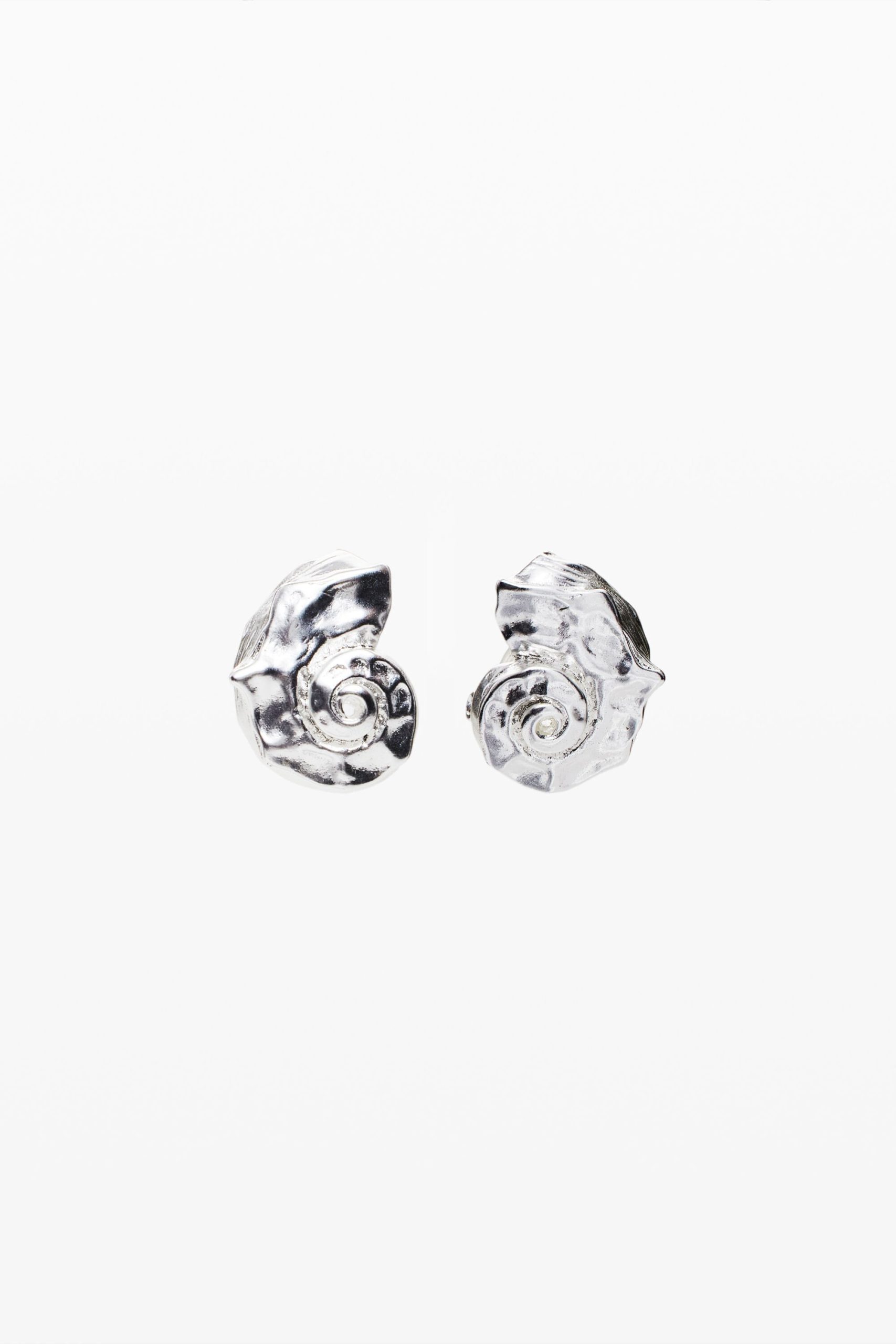 Knopvormige oorbellen in de vorm van een zeeschelp, verzilverd met 1e wet zilver van 3 micro inch en druksluiting. Collectie Zalio x Desigual; ontworpen door Gala Meyer.