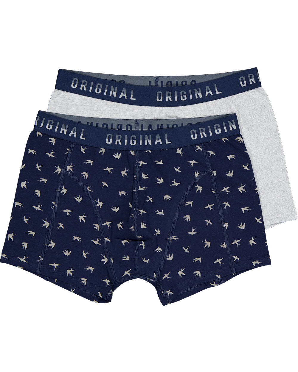 Twee herenboxers in verschillende prints en kleuren. Eén boxer is donkerblauw met een patroon van kleine vogels, de andere is lichtgrijs. De brede tailleband rekt mee, zodat de boxers goed blijven zitten. Dankzij het hoge percentage katoen met een beetje elastaan voelt de stof zacht aan en sluit hij prettig aan op je lichaam.