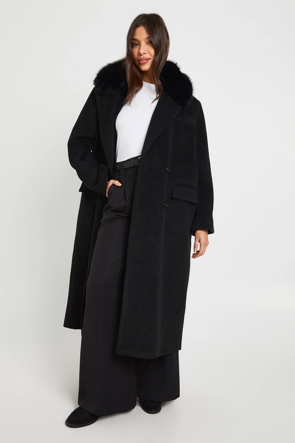 Home » Dames » Jassen » Winterjassen » Overmaat dubbelgeknoopte jas met wollen look en kunstbontaccent