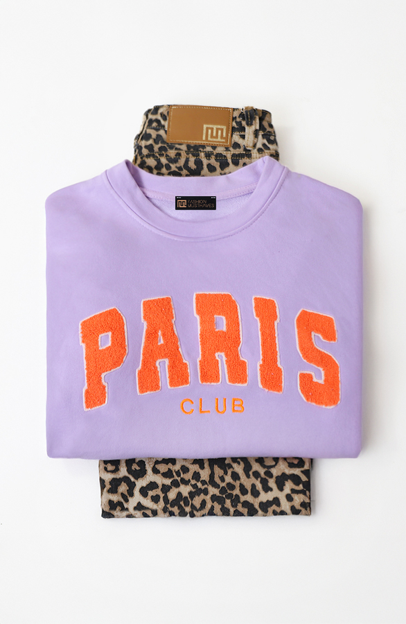 Product: Voeg een vleugje kleur toe aan je look met deze oversized lila trui met opvallende oranje Paris tekst — comfy, trendy en perfect voor elke casual outfit!Sizes: ONE SIZE, suitable for ladies with sizes S(36, M(38, L(40 Fit: valt oversizedModel: 178 cm and wears size One SizeDetails: ronde hals, lange mouwen, tekst op de voorkant and zachte stof Materials: 15% Polyester, 85% KatoenWashing instructions: 30 graden wasmachine