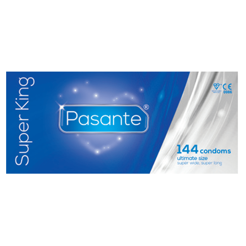 Worstel je met het vinden van de juiste maat condoom zonder het gevoel te hebben dat het je penis vernauwt? Dan zijn Pasante Super King Condooms wellicht iets voor jou. Ontworpen voor de heren die een condoom nodig hebben dat groter is dan groot, maken Pasante Super King-condooms indruk met een nominale breedte van 69 mm en een lengte van 210 mm. Deze extra grote condooms zijn langer en breder dan Pasante King Size en zijn perfect voor mannen met royale afmetingen – of mannen die normaal een grote maat dragen, maar een condoom nodig hebben voor gebruik met seksspeeltjes of een G-Spot penisring. Het product heeft een gladde, zachte textuur die aanvoelt als zijde. Relatief dun en zeer flexibel, deze condooms passen als een handschoen en belemmeren de beweging niet. Dankzij de dunne huls van 0,07 mm kun je ook alle warmte van je partner voelen, voor echt bevredigende geslachtsgemeenschap. Deze condooms zijn geschikt voor vaginale, orale en anale seks. (https://www.condoom.nl/blog/seks-tips/eerste-keer-anale-seks) Pasante Super King-condooms zijn gemaakt van natuurlijk rubberlatex en zijn veganistisch. Ze zijn geschikt voor bewuste gebruikers en mensen die allergisch zijn voor caseïne. Een plezierige hoeveelheid glijmiddel verhogen ze de gladheid en verminderen ze het risico op irritatie bij onvoldoende natuurlijke smering. Eventueel kan extra glijmiddel worden aangebracht. Alle Pasante condooms zijn elektronisch getest op veiligheid en overtreffen de Europese normen. Ze worden geleverd in individuele wikkels gemarkeerd met CE en BSI Kitemark. Lees ook: Welke condoom maat heb ik? (https://www.condoom.nl/blog/condoom-advies/welk-condoom-moet-ik-kopen)