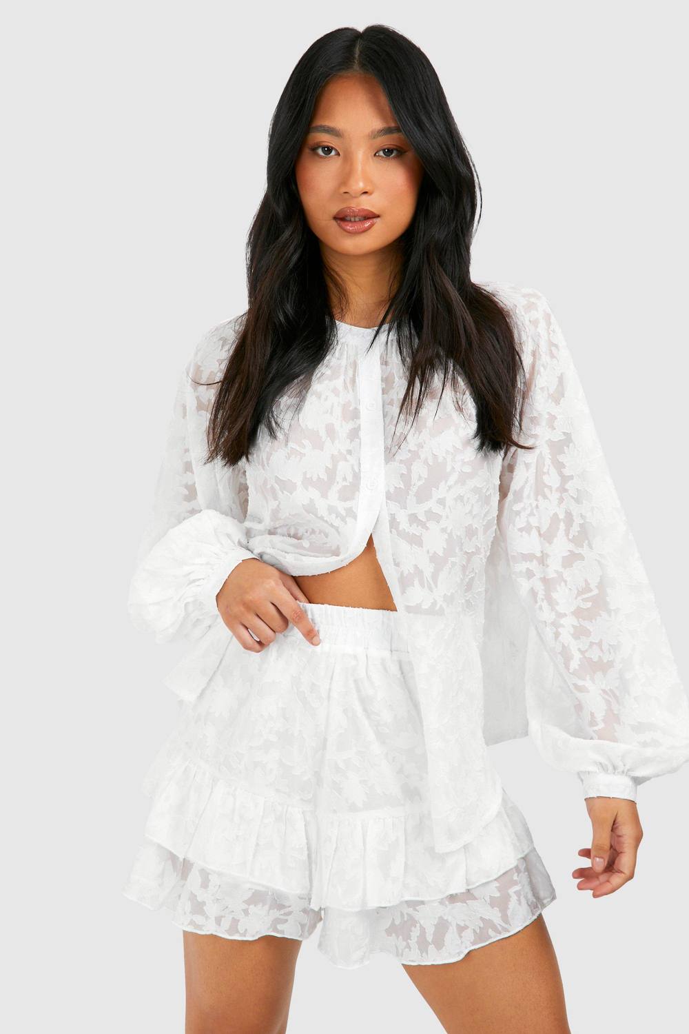 Doorzichtige, getextureerde stof voor een luchtige strandlook Cropped topje met lange, volumineuze mouwen High-waisted shorts met dubbele laag ruches Gecoordineerde tweedelige set voor moeiteloze styling Elastische tailleband voor een comfortabele pasvorm Maak een statement tijdens je volgende strandvakantie met deze opvallende petite tweedelige set. De doorzichtige, getextureerde stof voegt een vleugje allure toe terwijl jij koel blijft onder de zon. Het cropped topje heeft wijd vallende mouwen die een romantische silhouet creeren, perfect om van de zeebries te genieten. In combinatie met high-waisted shorts versierd met speelse dubbele laag ruches biedt deze outfit zowel stijl als comfort. Ideaal om langs de kust te wandelen, te loungen bij het zwembad of te genieten van een cocktail aan een strandbar. Draag eroverheen je favoriete badkleding voor een chique cover-up, of style het met sandalen met bandjes en opvallende oorbellen voor een diner bij zonsondergang. Deze veelzijdige set is een must-have voor elke zonovergoten vakantie, belichamend de zorgeloze geest van de zomer en laat je moeiteloos overgaan van strand naar bar. boohoo Dames Petite doorzichtige getextureerde stof strandshort | Ivory | Maat: 36
