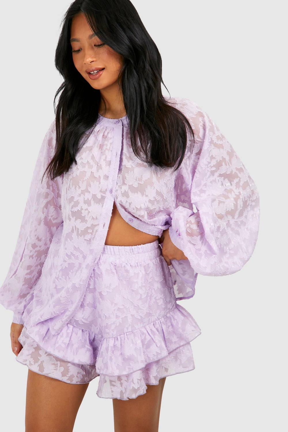Getextureerde, semi-doorzichtige stof voor een luchtige strandlook Elastische tailleband voor een comfortabele pasvorm Lagige geplooide zoom voegt speelse beweging toe Bijpassende cover-up met lange mouwen en vetersluiting aan de voorkant Veelzijdige tweedelige set voor mix-en-match styling Val op op het strand met deze opvallende petite short en cover-up set. De getextureerde, semi-doorzichtige stof zorgt voor een licht en luchtig gevoel, perfect voor hete zomerdagen. De short beschikt over een flatterende elastische tailleband en een speelse gelaagde geplooide zoom die een vleugje vrouwelijke charme toevoegt. In combinatie met de bijpassende cover-up met lange mouwen, die pronkt met volumineuze mouwen en een vetersluiting aan de voorkant, biedt deze set eindeloze stylingmogelijkheden. Draag de onderdelen samen voor een gecoordineerde uitstraling, of combineer ze met andere strandkleding. Ideaal om te loungen bij het zwembad, langs de kust te wandelen of te genieten van cocktails in een strandbar. Deze veelzijdige set wordt al snel jouw favoriete keuze voor elke zonnige vakantie of strandavontuur. boohoo Dames Petite doorzichtige getextureerde stoffen strandshort | Lilac | Maat: 36
