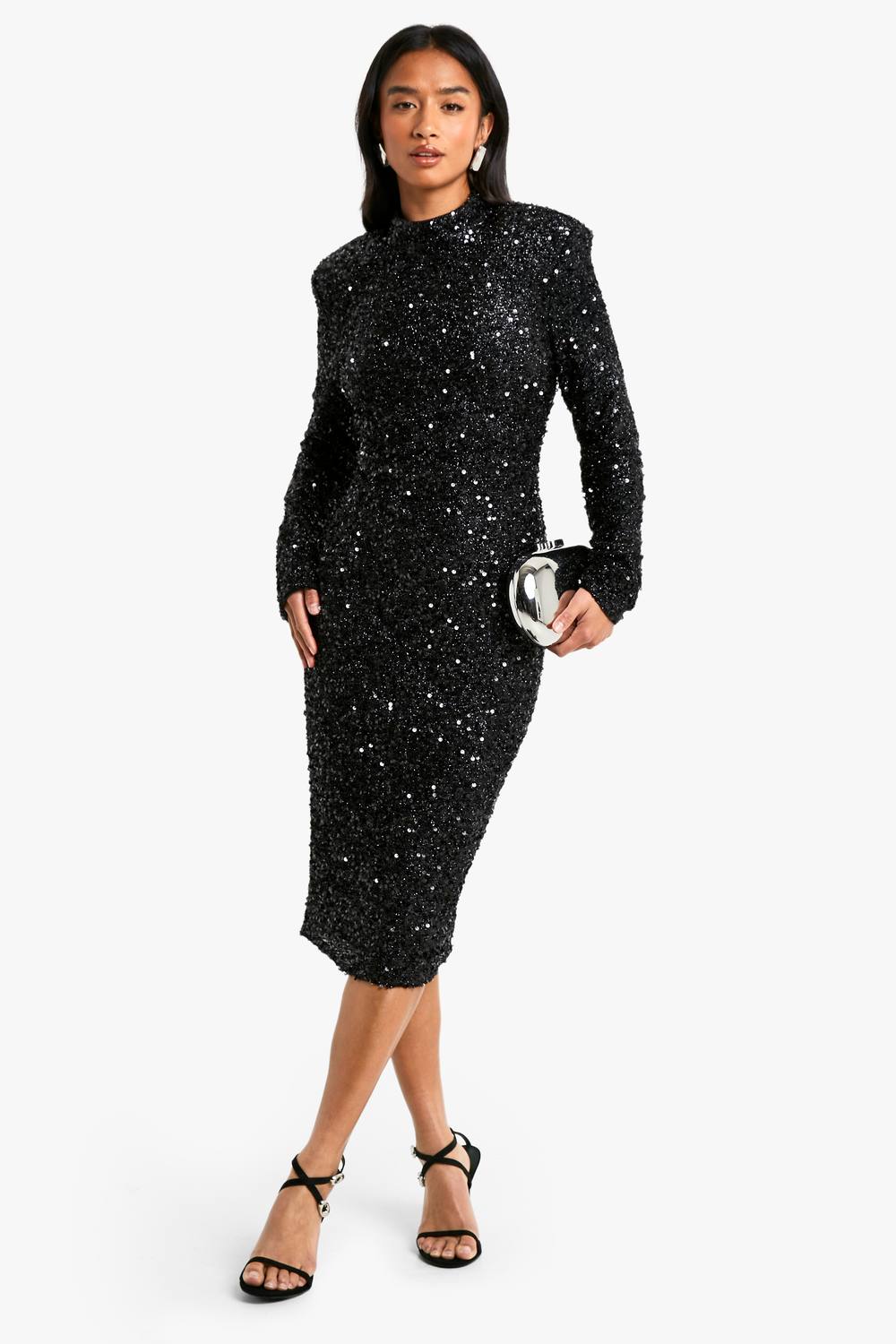 Adembenemende paillettenversiering over de gehele jurk Indrukwekkend schoudervullingsdetail voor een gestructureerd silhouet Verleidelijk open rugontwerp Flatteuze midi-lengte Lange mouwen voor een vleugje verfijning Maak een statement op je volgende speciale gelegenheid met deze showstopper midi-jurk met pailletten. De opvallende schoudervullingen creeren een gedurfde, gestructureerde look, terwijl het rugloze ontwerp een sensuele touch aan je ensemble toevoegt. Perfect voor formele evenementen, combineert deze jurk glamour met een eigentijdse stijl. Combineer hem met sandalen met bandjes en opvallende oorbellen voor een look die de aandacht trekt op bruiloften, cocktailparty’s of avondgala’s. De veelzijdige midi-lengte zorgt voor vrije beweging op de dansvloer, zodat je de hele avond zult stralen. Voor een meer subtiele benadering kun je er een strak blazer overheen dragen voor een drankje voor het diner, om dan de volledige glitter te onthullen zodra de avond vordert. Deze Boohoo-jurk is ontworpen om je te laten opvallen in de menigte, en belichaamt de filosofie van het merk: leuke, inclusieve mode voor de zelfverzekerde, trendsettende vrouw. boohoo Dames Petite Pailletten Schoudervulling Rugloze Midi-Jurk | Black | Maat: 34