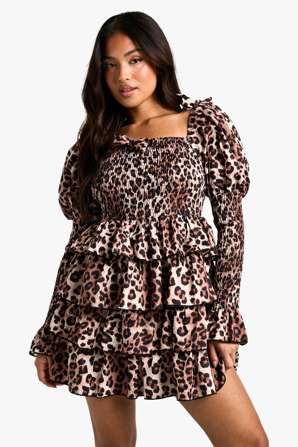 Petite Shirred Luipaard Shirred Laagjes Ruches Skaterjurk