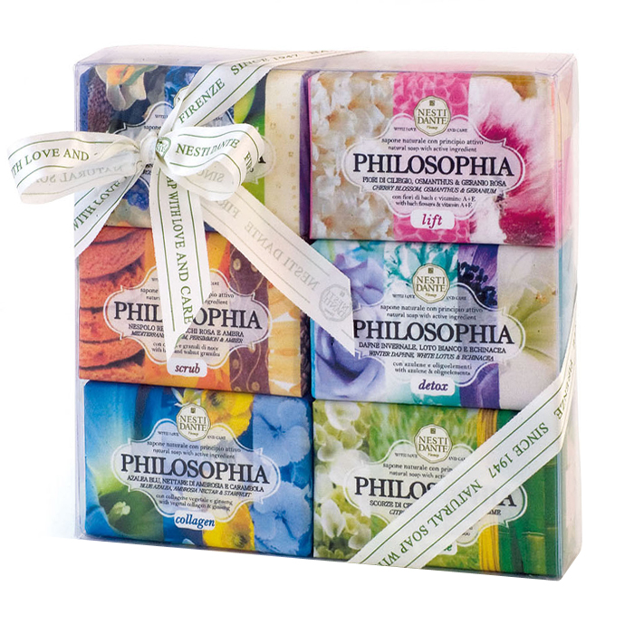 Cadeauset bestaande uit 6 luxe, handgemaakte zepen uit de Philosophia collectie van Nesti Dante. Nesti Dante zeep wordt op ambachtelijke wijze en met veel zorg en liefde vervaardigd in het Italiaanse Florence. De kwalitatief hoogwaardige zeep bevat 100% natuurlijke ingrediënten, afkomstig uit de heuvels van Toscane. Ieder stuk Nesti Dante zeep wordt individueel en met de hand verpakt in luxueus Florentijns papier dat geïnspireerd is op de prachtige schilderingen uit de Renaissance periode.Inhoud set:- Philosophia: Breeze zeep 150 gr- Philosophia: Collagen zeep 150 gr- Philosophia: Cream zeep 150 gr- Philosophia: Detox zeep 150 gr- Philosophia: Lift zeep 150 gr- Philosophia: Scrub zeep 150 gr