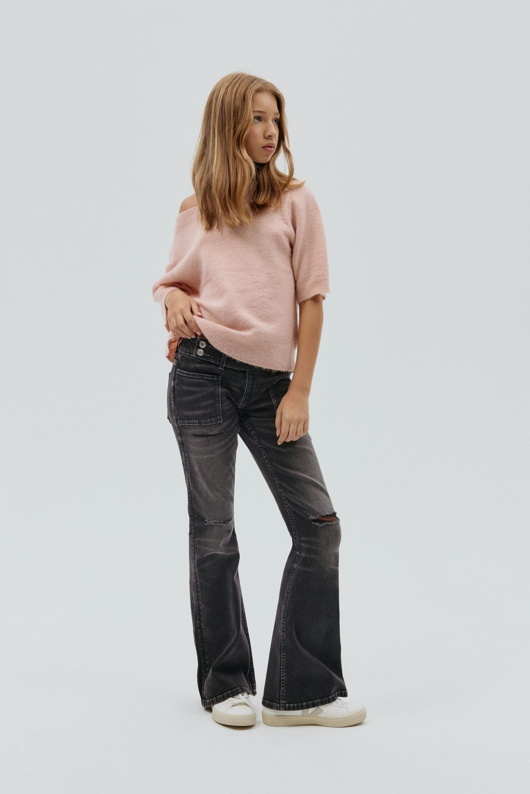 Jeansbroek met lage taille met scheuren aan de knieën. De spijkerbroek is grijs en heeft uitlopende pijpen. Het heeft gepatchte zakken aan de voorkant, een asymmetrische en dubbele knop aan de voorkant, een broeksband met elastisch trekkoord, een gulp en een normale lengte.