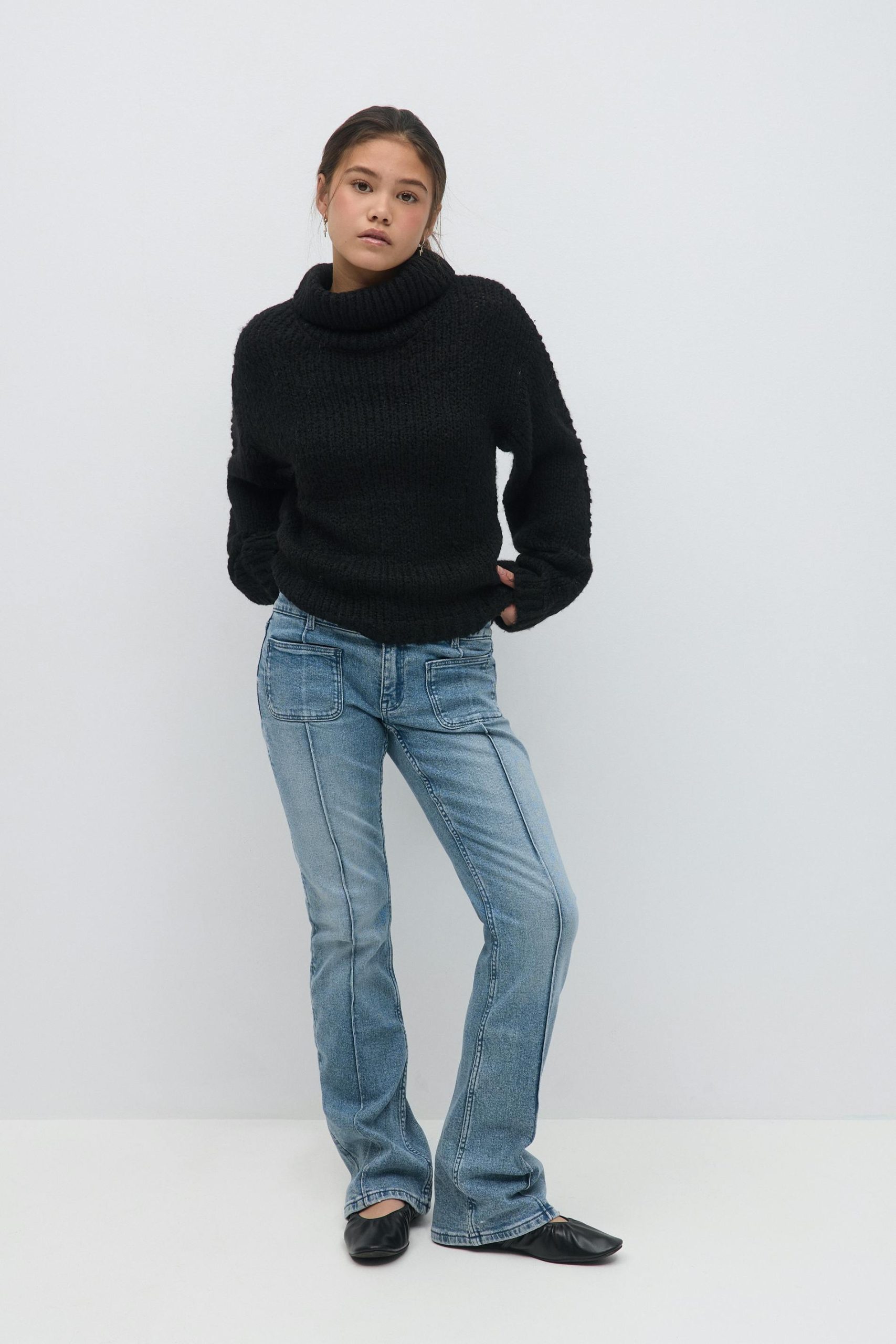 Flare jeans met gleuven aan de voorkant. De spijkerbroek is blauw en heeft lage stretch. Het heeft uitlopende pijpen, lage taille en zakken aan de voor- en achterzijde.