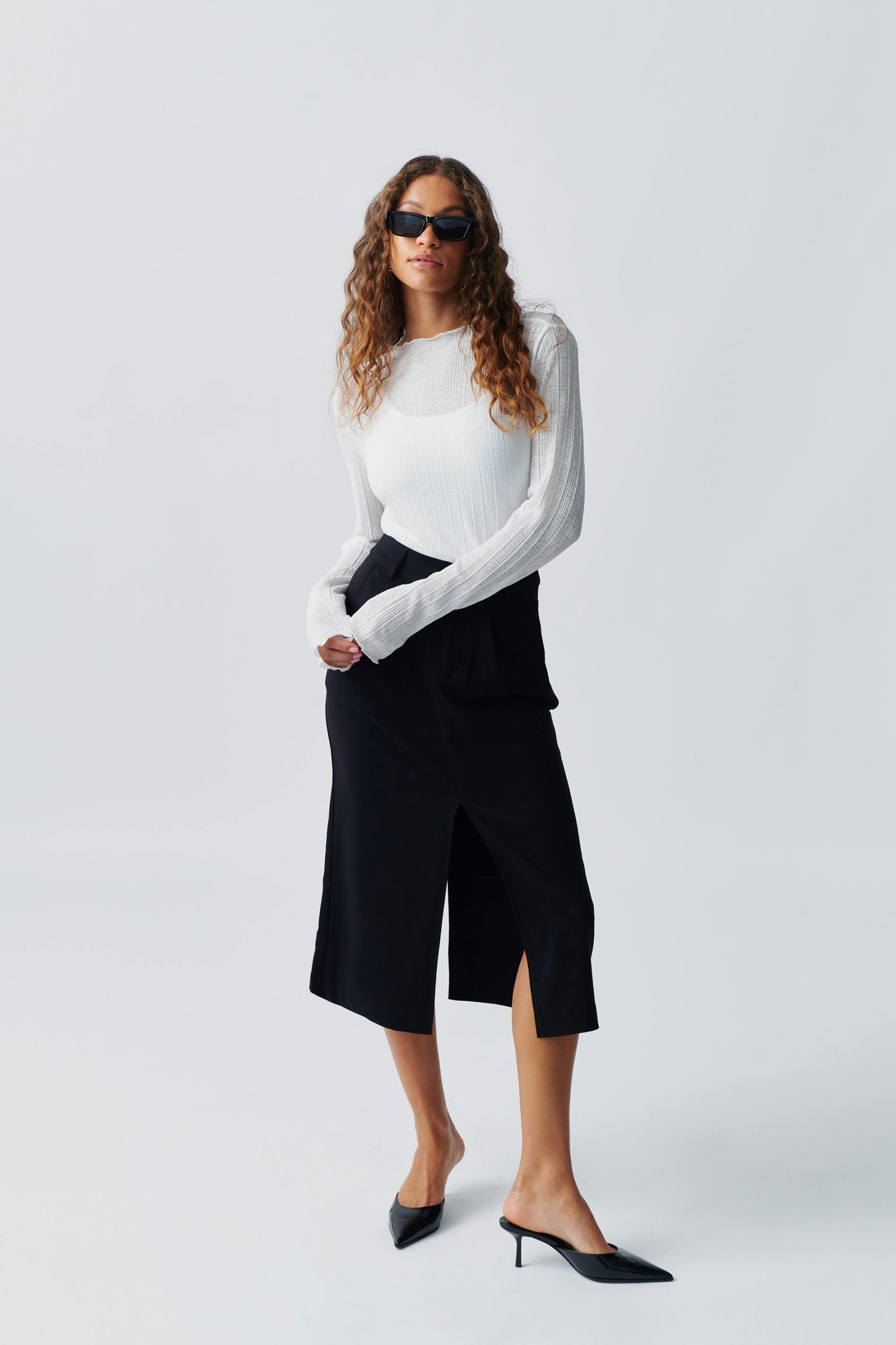 Geplisseerde rok met spleet. De rok is zwart en heeft achterzakken. Het heeft normale pasvorm, gulp, riemlussen en midi-lengte.