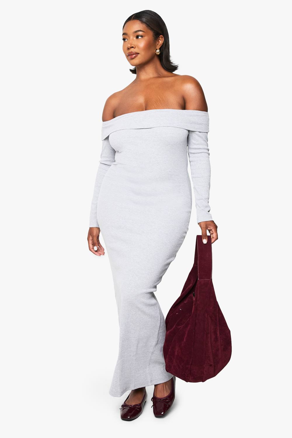 Plus Basic Geribbelde Bardot Maxi Jurk