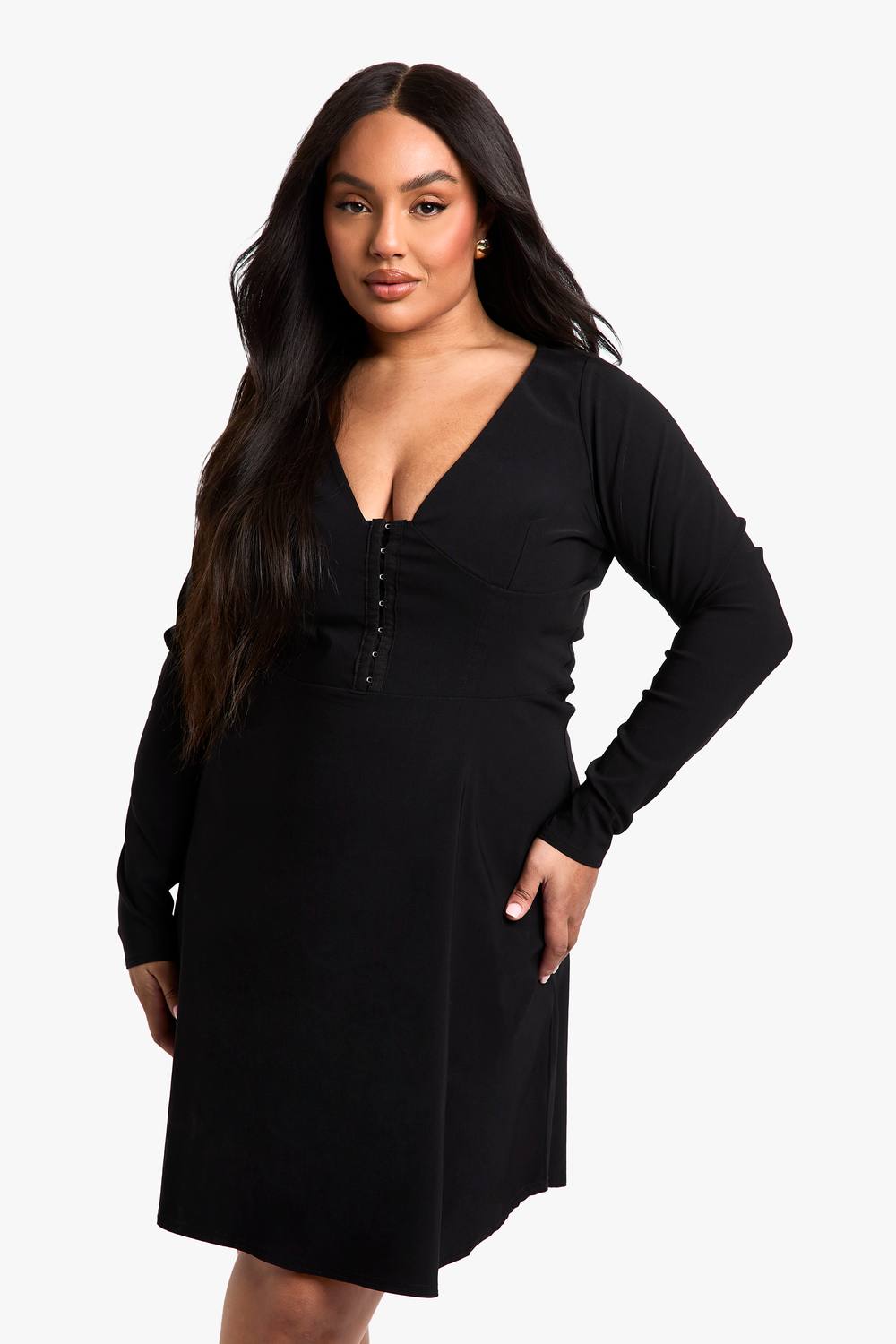 Flatterend skater silhouet met uitlopende rok Diepe V-hals voor een verleidelijk accent Lange mouwen voor veelzijdige styling Haak- en oogsluiting voegt een uniek detail toe Rekbare bengaline stof voor comfort en bewegingsvrijheid Maak een statement tijdens je volgende avondje uit met deze betoverende plus-size skaterjurk. Het speelse silhouet heeft een diepe V-hals die de aandacht trekt, terwijl de uitlopende rok een speelse en vrouwelijke vorm creeert. De lange mouwen bieden veelzijdigheid, zodat je moeiteloos kunt schakelen van dag naar nacht. De haak- en oogsluiting voegt een intrigerend detail toe, wat deze jurk onderscheidt van de rest. Perfect voor een avond in de club of een borrel met vrienden, is deze jurk ontworpen om je zelfverzekerd en stijlvol te laten voelen. Combineer het met bandjeshakken en een clutch voor een chique ensemble dat klaar is voor een avondje uit. De rekbare bengaline stof zorgt voor comfort de hele avond, zodat je zorgeloos de nacht door kunt dansen. boohoo Dames Plus Bengaline Haak & Oog Skaterjurk | Black | Maat: 56