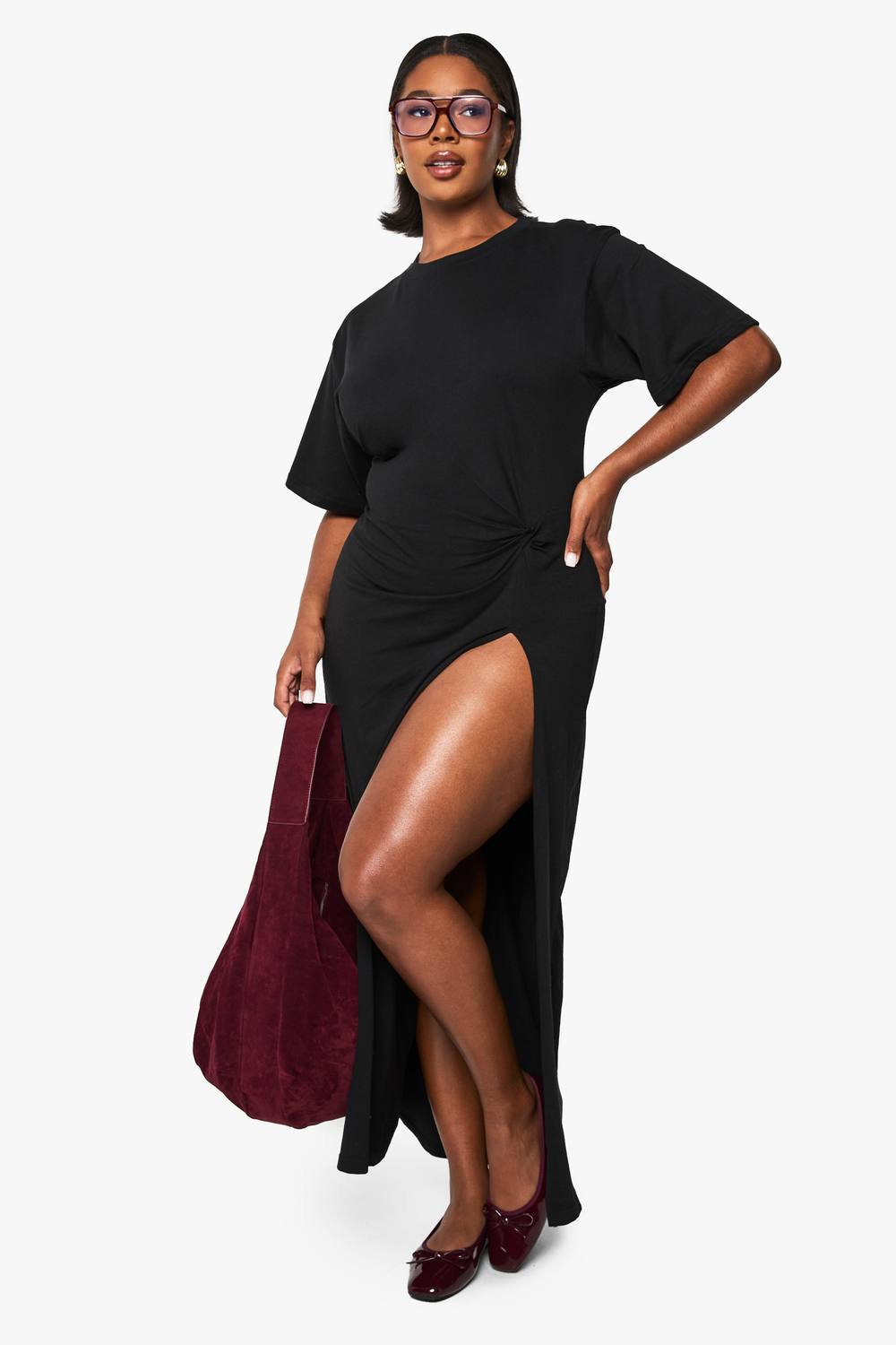 Plus Knoop Detail High Split T-shirtjurk – Flatterende T-shirtjurk silhouette Uniek geknoopt detail bij de taille Gedurfde zijsplit tot boven de dij Korte mouwen voor veelzijdig gebruik Maximale lengte voor een dramatische uitstraling Deze opvallende T-shirtjurk combineert comfort met een stijl die de aandacht trekt. De zachte katoenen stof zorgt voor draagcomfort gedurende de hele dag, terwijl het geknoopte detail bij de taille een flatterende silhoutte creëert die je rondingen accentueert. De gedurfde zijsplit tot boven de dij voegt een vleugje verleiding toe, perfect om je favoriete sneakers of sandalen te showen. Style dit veelzijdige stuk met opvallende witte sneakers en een spijkerjack voor een casual look overdag. Voor avonddrankjes met vrienden vervang je de sneakers door sandalen met bandjes en voeg je statement oorbellen toe om moeiteloos van dag naar nacht te gaan. Deze jurk is ideaal voor diverse informele gelegenheden, van familiebijeenkomsten tot weekendbrunches, en biedt zowel comfort als stijl in één moeiteloos pakket.