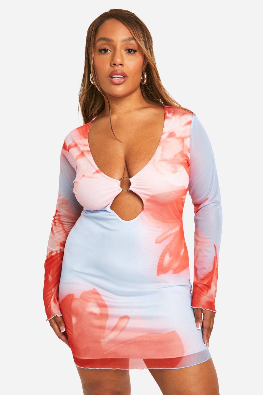 Bloemige mesh minidress met lange mouwen Gedurfde uitsnijding bij het decollete Nauwsluitend silhouet Levendig abstract printontwerp Veelzijdige plus-size stylingoptie Maak een gedurfd statement met deze opvallende mesh minidress uit Boohoo’s plus-size collectie. Het ontwerp met lange mouwen kenmerkt zich door een opvallende abstracte bloemenprint die de aandacht opeist, terwijl de nauwsluitende snit je rondingen op de juiste plekken accentueert. Het gedurfde uitsnijdetail bij het decollete voegt een vleugje allure toe, perfect voor die avonden waarop je de show wilt stelen. Combineer deze blikvanger met sandalen met bandjes en opvallende oorbellen voor een avondje uit, of draag hem casual met stoere sneakers en een leren jasje voor een nonchalante, maar edgy look. De veelzijdigheid van deze jurk maakt hem geschikt voor verschillende gelegenheden, van een cocktailborrel met vriendinnen tot een nachtje dansen in je favoriete club. Omarm je zelfvertrouwen en laat deze jurk het pronkstuk worden van je avondgarderobe. boohoo Dames Plus Mesh Bloemenprint Cut Out Detail Lange Mouwen Mini-Jurk | Blue | Maat: 56