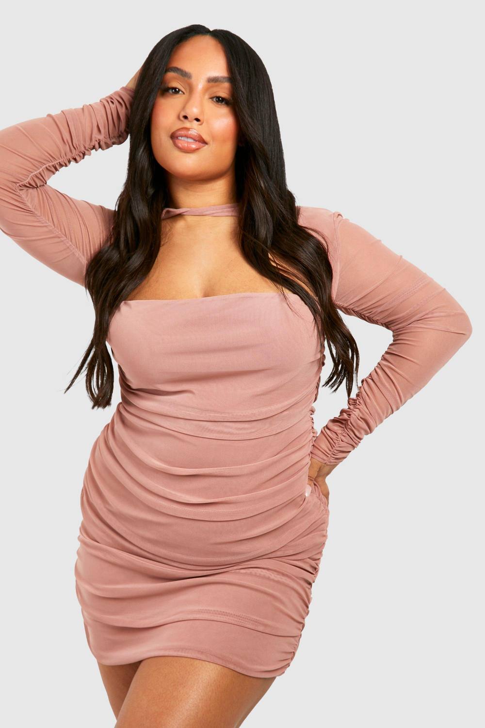 Plus Mesh Twist Detail Gerafelde Bodycon Jurk