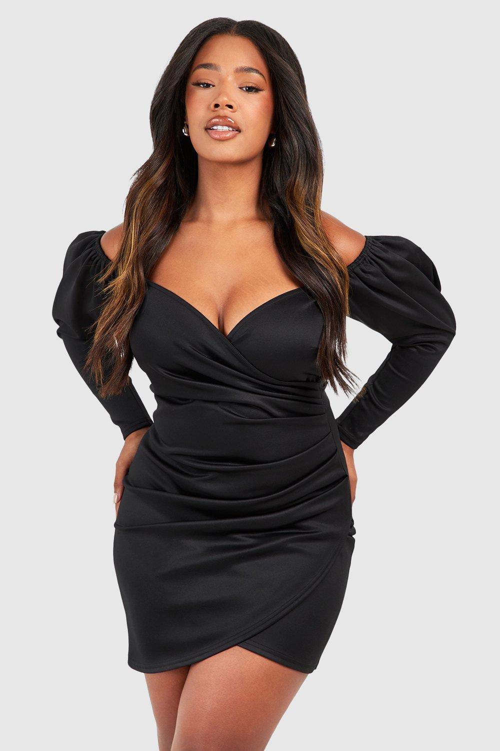 Deze plus-size wrap jurk staat op het punt je nieuwe favoriet te worden. Met een omsluitend ontwerp dat je taille accentueert en een zachte V-hals creeert, valt niet te ontkennen dat een plus-size wrap jurk een plaats verdient in je jurkencollectie. Of je nu dol bent op bloemenprints, ingetogen zwart of opvallend rood voor een avondje uit, het is tijd om je figuur te showen in deze flatterende jurk. Stijl: Bodycon JurkStof: ScubaLengte: MiniMouwlengte: Lange Mouwen boohoo Dames Plus Off-Shoulder Geplooide Detail Wrap Jurk | Black | Maat: 44