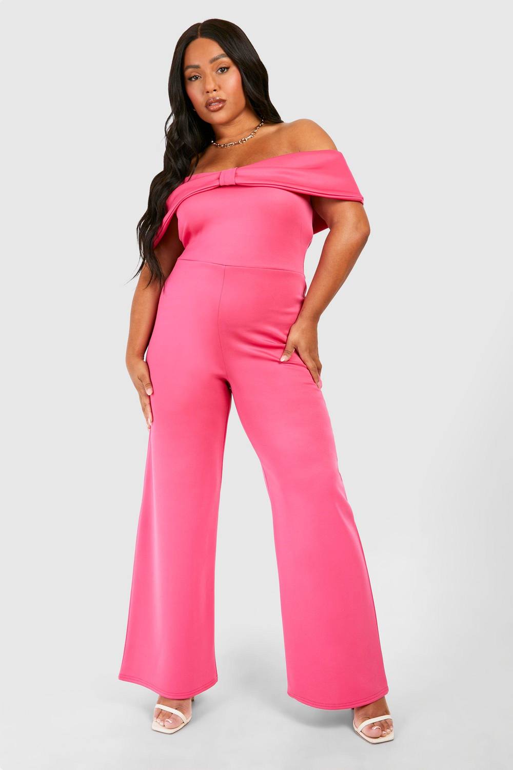 Vleiende Bardot-halslijn met elegant strikdetail Nauwsluitende scuba-stof voor een gestroomlijnd silhouet Wijde pijpen voor een dramatische, vloeiende uitstraling Off-shoulder stijl accentueert het decollete Veelzijdige jumpsuit geschikt voor diverse avondgelegenheden Maak een gedurfd statement in deze opvallende Bardot-jumpsuit, perfect voor de modebewuste vrouw die graag de aandacht trekt. De off-shoulder halslijn met het charmante strikdetail voegt een vleugje vrouwelijke allure toe, terwijl de nauwsluitende scuba-stof zorgt voor een soepele, vleiende pasvorm. Het ontwerp met wijde pijpen creeert een dramatisch silhouet dat zowel comfortabel als chic is. Ideaal voor een avondje uit in de stad, deze jumpsuit kan opgelost en gestyled worden afhankelijk van je stemming. Combineer hem met sandalen met bandjes en opvallende oorbellen voor een glamourous clublook, of houd het wat ingetogener met een cropped jack en enkellaarsjes voor een borrel met vrienden. Het veelzijdige ontwerp maakt dit een favoriet stuk voor diverse avondgelegenheden, van cocktailparty’s tot urban bar-hopping. Omarm je rondingen en straal zelfvertrouwen uit in deze oogstrelende ensemble die je de hele avond in de schijnwerpers zet. boohoo Dames Plus Scuba Bardot Jumpsuit met strikdetail | Hot Pink | Maat: 56