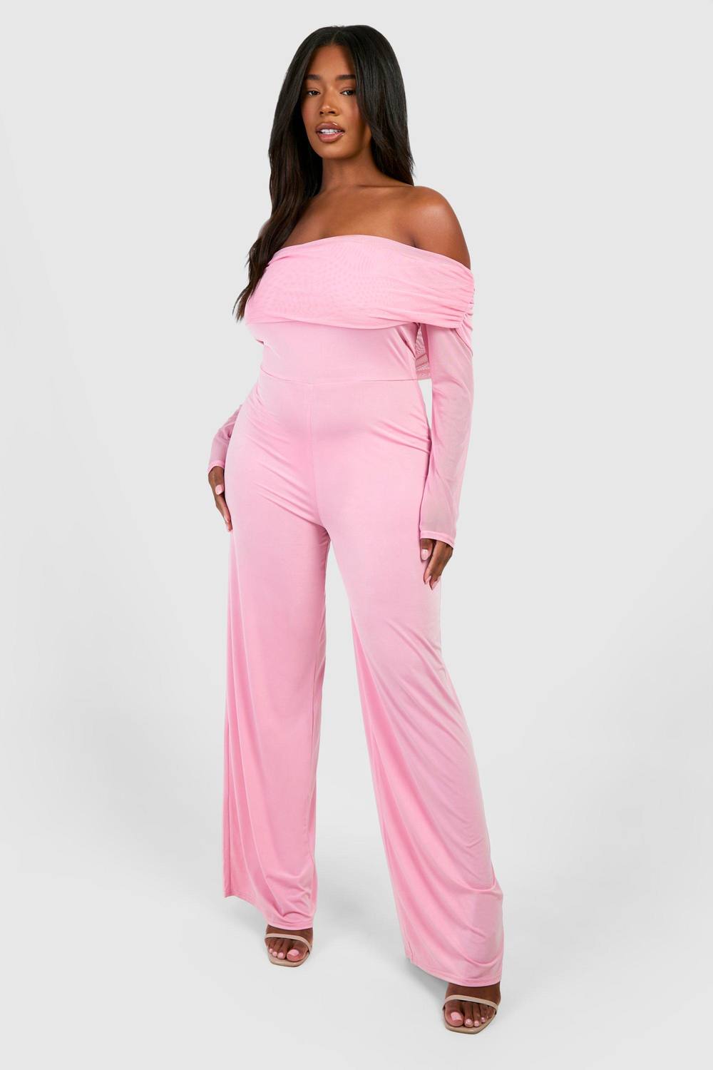 Plus Slinky & Mesh Bardot jumpsuit met wijde pijp