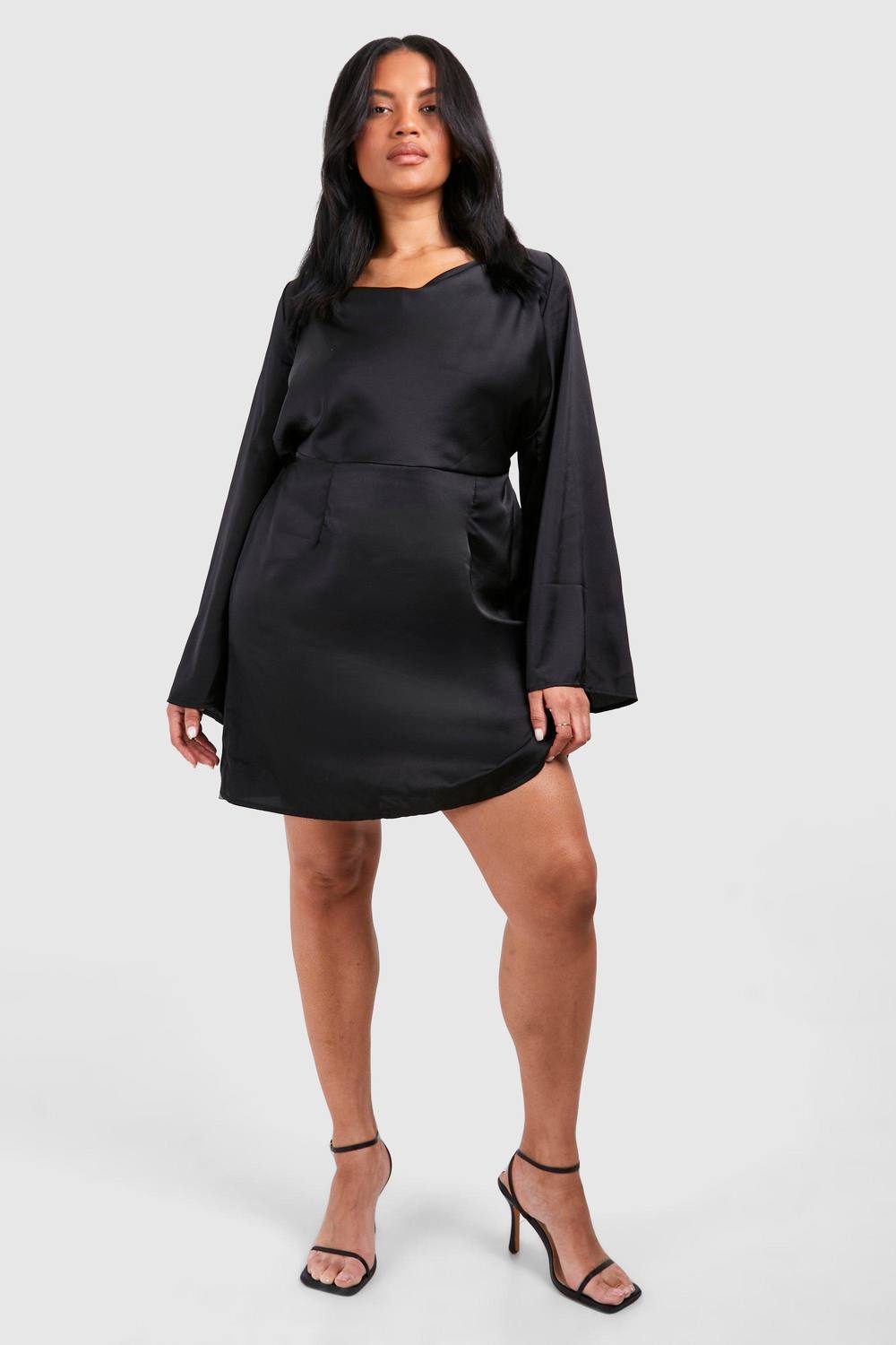 Plus Textured Cowl Mini-Jurk Met Uitlopende Mouwen, Black