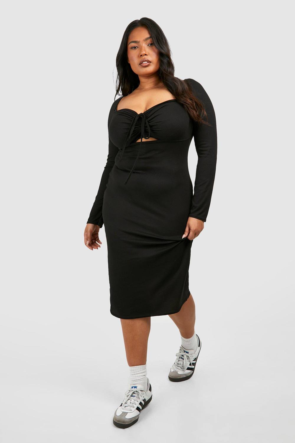 Plus Zachte Rib Ruché Strik-Hals Jurk, Black