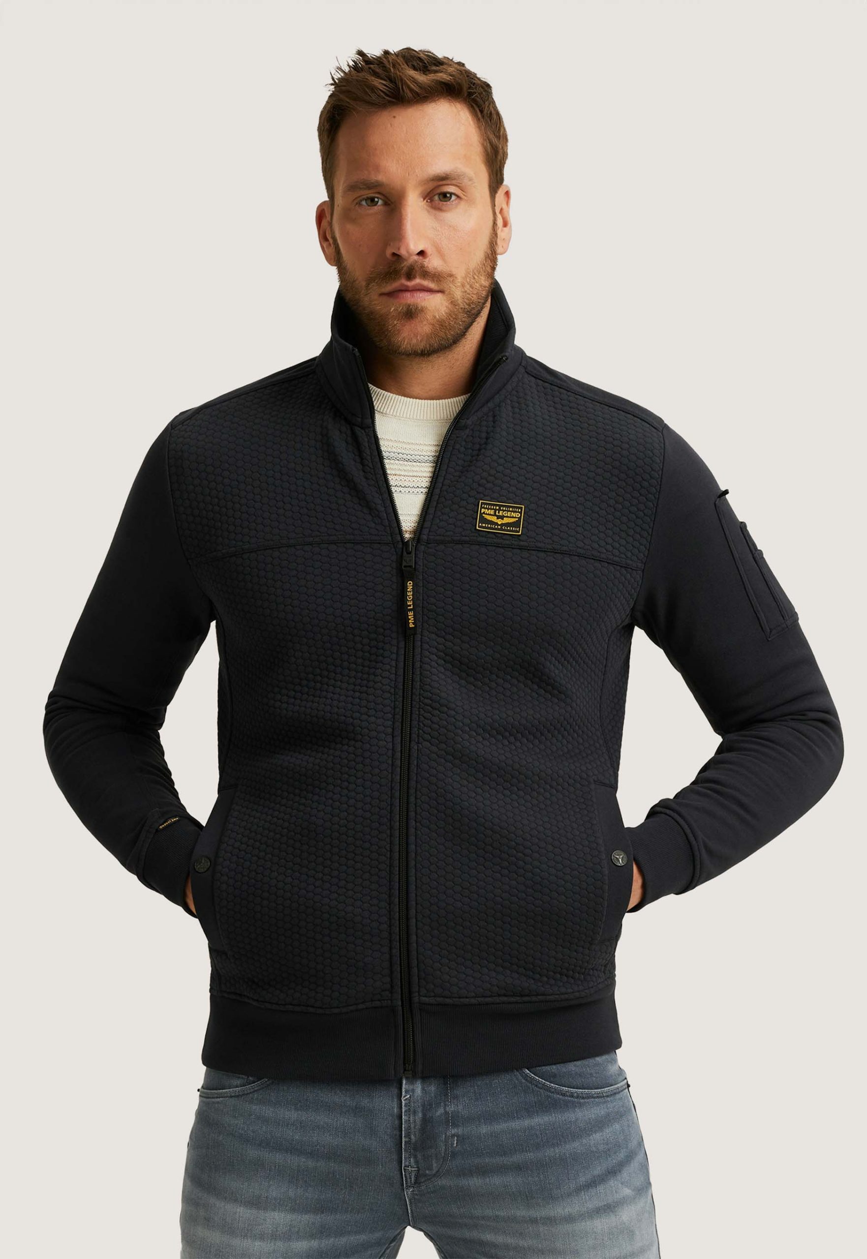 Dit is het PSW2508436 Interlock Zip Jacket van het merk PME Legend. Het jack is gemaakt van een comfortabele katoenen interlock sweatstof met jacquardpatroon en heeft een regular fit. Het model is voorzien van een ritssluiting, een opstaande kraag en ribgebreide mouwboorden. Verder heeft het twee voorzakken met drukknopen. De kenmerkende PME Legend details, zoals de logo’s op borst, rug en mouw, maken dit item compleet.