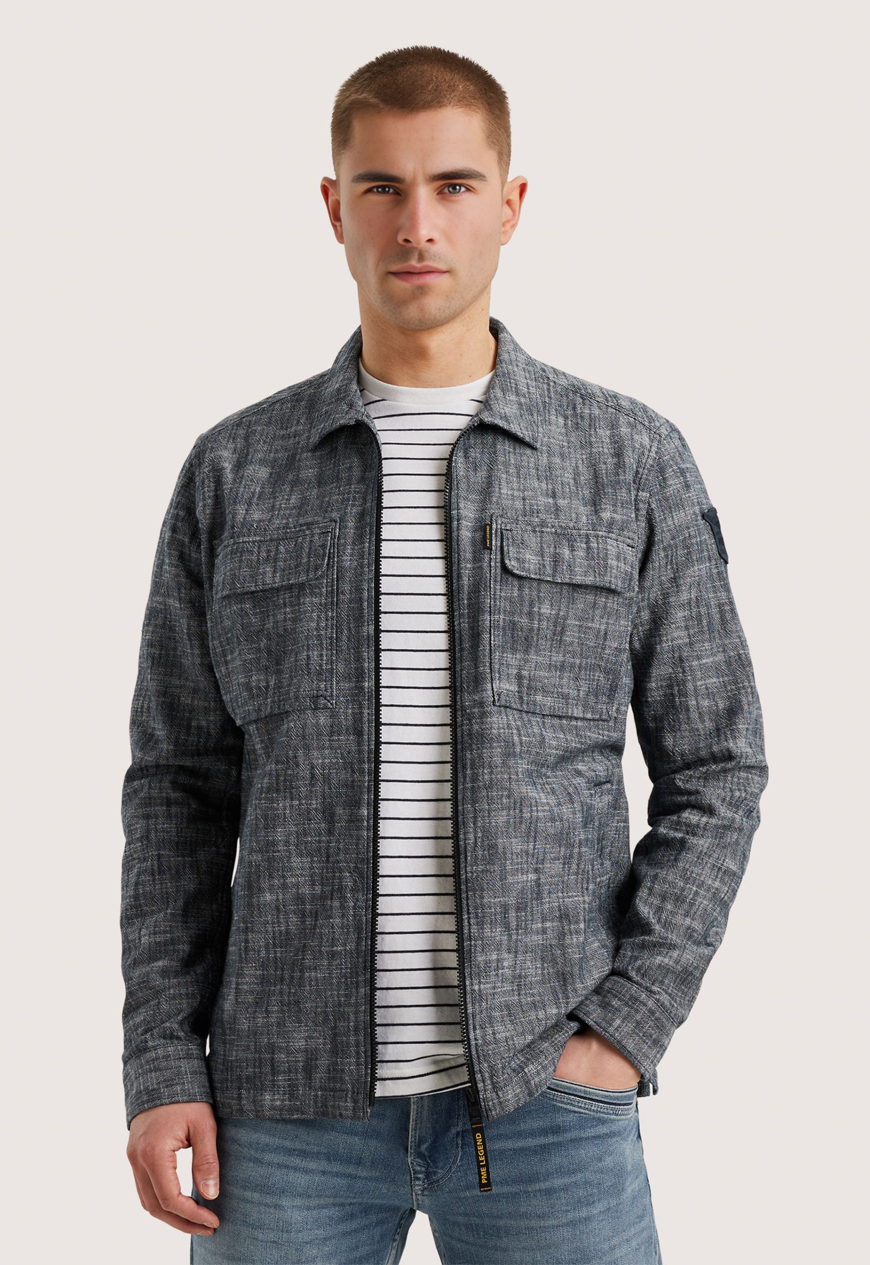 Dit is de PSI2502228 Tone Slub Longsleeve van het merk PME Legend. De longsleeve heeft een regular pasvorm, lange mouwen, ritssluiting, krent kraag en manchet met een knoop. Het item heeft vier zakken, sluitbare borstzakken en het logo van PME Legend zit op de borst en op de mouw.