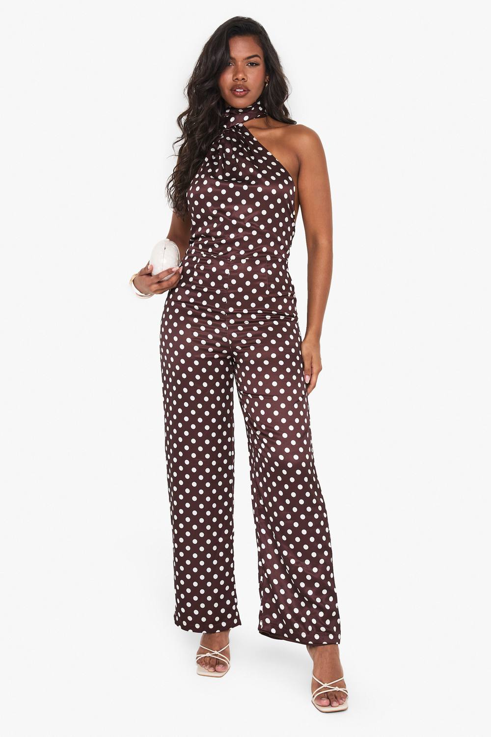 Polkadot Satijnen Jumpsuit Met Sjaaldetail, Chocolate