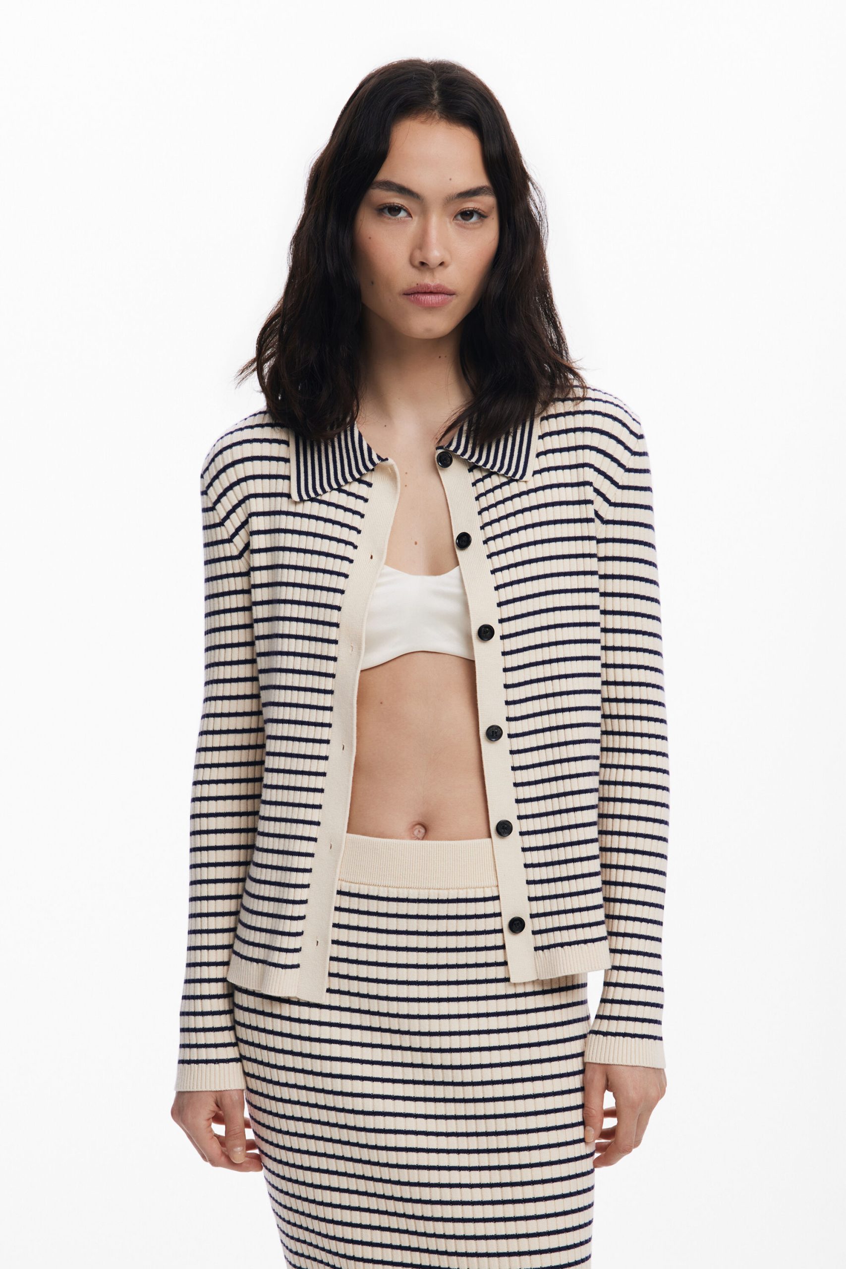 Nauwsluitend vestachtig trui, met knopen aan de voorkant, polokraag en horizontaal strepenpatroon.